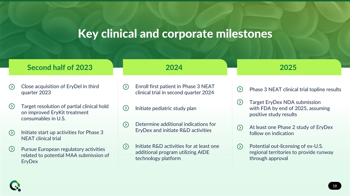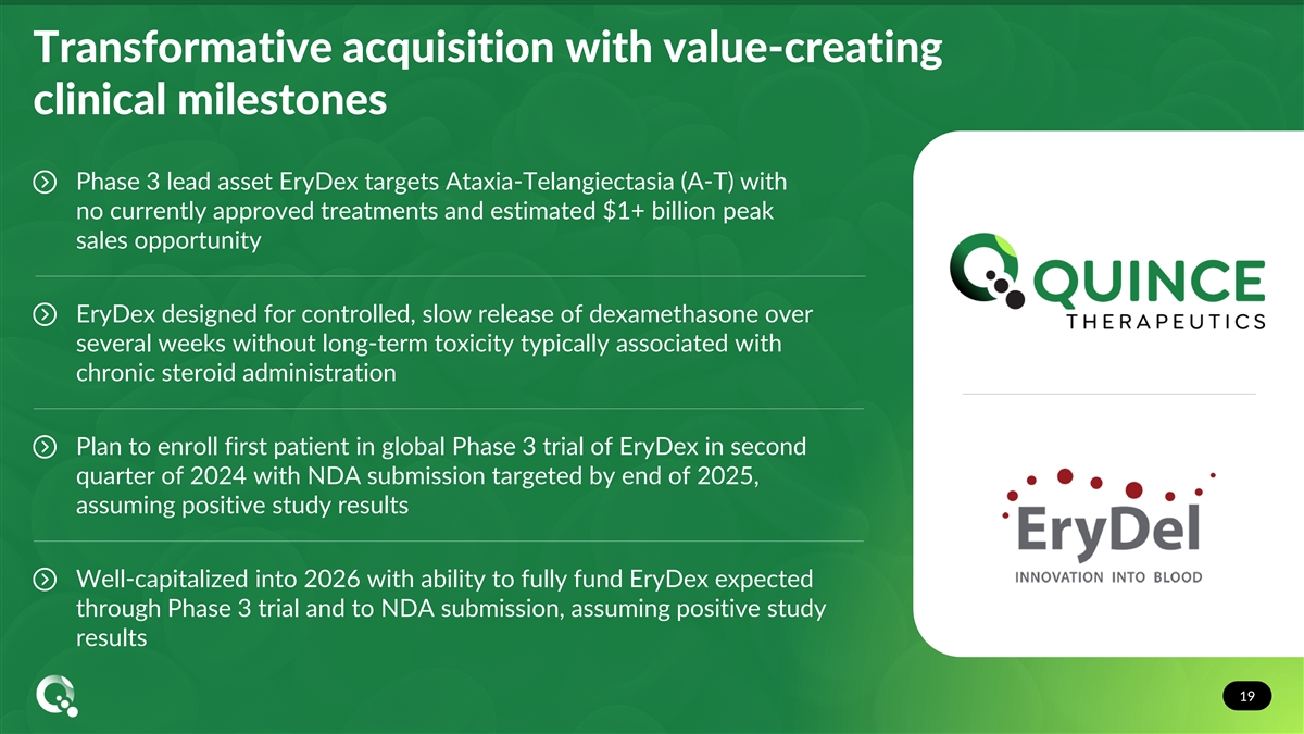 Key clinical and corporate milestones Second half of 2023 2024 2025 Close acquisition of EryDel in third Enroll first patient in Phase 3 NEAT Phase 3 NEAT clinical trial topline results quarter 2023 clinical trial in second quarter 2024 Target EryDex NDA submission Target resolution of partial clinical hold Initiate pediatric study plan with FDA by end of 2025, assuming on improved EryKit treatment positive study results consumables in U.S. Determine additional indications for At least one Phase 2 study of EryDex EryDex and initiate R&D activities Initiate start up activities for Phase 3 follow on indication NEAT clinical trial Initiate R&D activities for at least one Potential out-licensing of ex-U.S. Pursue European regulatory activities additional program utilizing AIDE regional territories to provide runway related to potential MAA submission of technology platform through approval EryDex 18