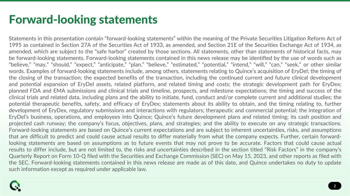 Forward-looking statements Statements in this presentation contain “forward-looking statements” within the meaning of the Private Securities Litigation Reform Act of 1995 as contained in Section 27A of the Securities Act of 1933, as amended, and Section 21E of the Securities Exchange Act of 1934, as amended, which are subject to the “safe harbor” created by those sections. All statements, other than statements of historical facts, may be forward-looking statements. Forward-looking statements contained in this news release may be identified by the use of words such as “believe,” “may,” “should,” “expect,” “anticipate,” “plan,” “believe,” “estimated,” “potential,” “intend,” “will,” “can,” “seek,” or other similar words. Examples of forward-looking statements include, among others, statements relating to Quince’s acquisition of EryDel; the timing of the closing of the transaction; the expected benefits of the transaction, including the continued current and future clinical development and potential expansion of EryDel assets, related platform, and related timing and costs; the strategic development path for EryDex; planned FDA and EMA submissions and clinical trials and timeline, prospects, and milestone expectations; the timing and success of the clinical trials and related data, including plans and the ability to initiate, fund, conduct and/or complete current and additional studies; the potential therapeutic benefits, safety, and efficacy of EryDex; statements about its ability to obtain, and the timing relating to, further development of EryDex, regulatory submissions and interactions with regulators; therapeutic and commercial potential; the integration of EryDel’s business, operations, and employees into Quince; Quince’s future development plans and related timing; its cash position and projected cash runway; the company’s focus, objectives, plans, and strategies; and the ability to execute on any strategic transactions. Forward-looking statements are based on Quince’s current expectations and are subject to inherent uncertainties, risks, and assumptions that are difficult to predict and could cause actual results to differ materially from what the company expects. Further, certain forward- looking statements are based on assumptions as to future events that may not prove to be accurate. Factors that could cause actual results to differ include, but are not limited to, the risks and uncertainties described in the section titled “Risk Factors” in the company’s Quarterly Report on Form 10-Q filed with the Securities and Exchange Commission (SEC) on May 15, 2023, and other reports as filed with the SEC. Forward-looking statements contained in this news release are made as of this date, and Quince undertakes no duty to update such information except as required under applicable law. 2