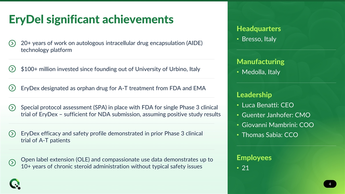 Transformative acquisition with value-creating clinical milestones Phase 3 lead asset EryDex targets Ataxia-Telangiectasia (A-T) with no currently approved treatments and estimated $1+ billion peak sales opportunity EryDex designed for controlled, slow release of dexamethasone over several weeks without long-term toxicity typically associated with chronic steroid administration Plan to enroll first patient in global Phase 3 trial of EryDex in second quarter of 2024 with NDA submission targeted by end of 2025, assuming positive study results Well-capitalized into 2026 with ability to fully fund EryDex expected through Phase 3 trial and to NDA submission, assuming positive study results 3 3 3