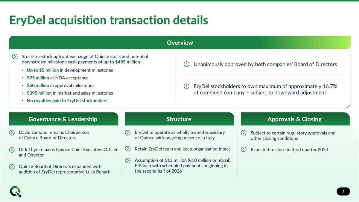 EryDel acquisition transaction details Overview Stock-for-stock upfront exchange of Quince stock and potential downstream milestone cash payments of up to $485 million Unanimously approved by both companies’ Board of Directors • Up to $5 million in development milestones • $25 million at NDA acceptance • $60 million in approval milestones EryDel stockholders to own maximum of approximately 16.7% of combined company – subject to downward adjustment • $395 million in market and sales milestones • No royalties paid to EryDel stockholders Governance & Leadership Structure Approvals & Closing David Lamond remains Chairperson EryDel to operate as wholly owned subsidiary Subject to certain regulatory approvals and of Quince Board of Directors of Quince with ongoing presence in Italy other closing conditions Retain EryDel team and keep organization intact Dirk Thye remains Quince Chief Executive Officer Expected to close in third quarter 2023 and Director Assumption of $13 million (€10 million principal) EIB loan with scheduled payments beginning in Quince Board of Directors expanded with the second half of 2026 addition of EryDel representative Luca Benatti 5