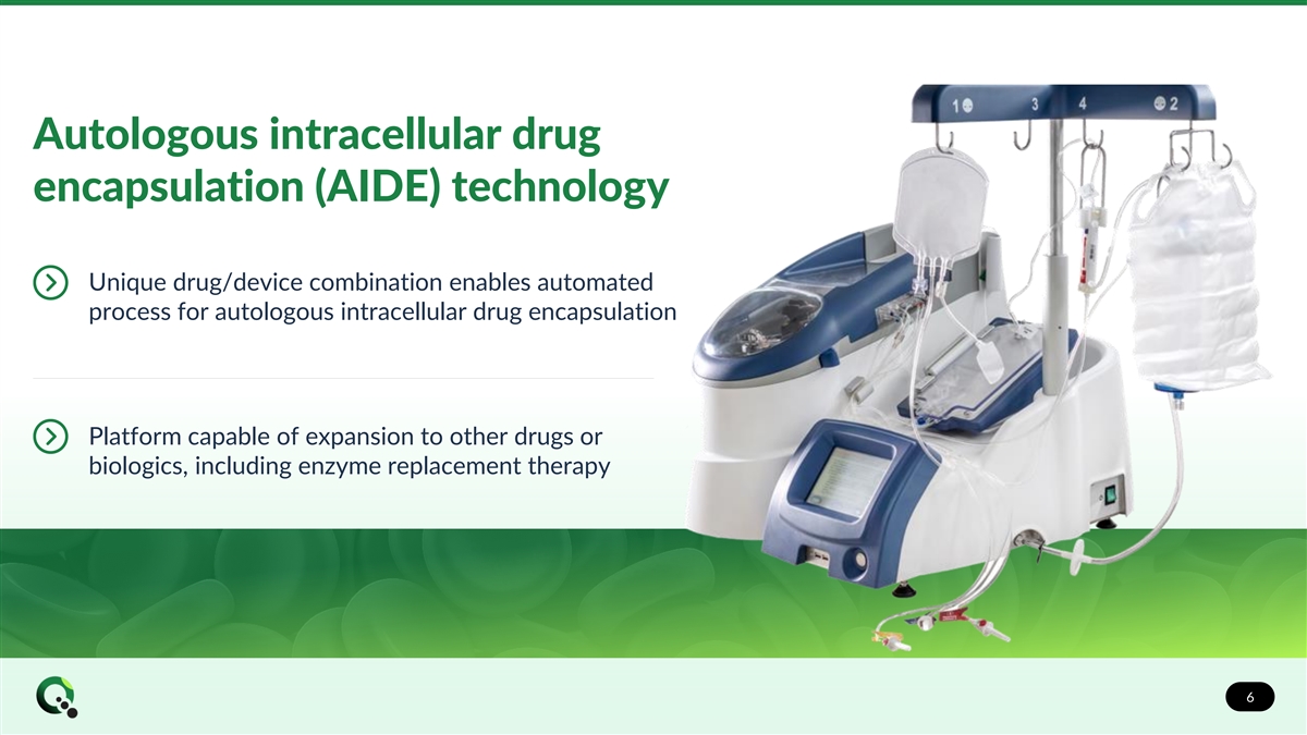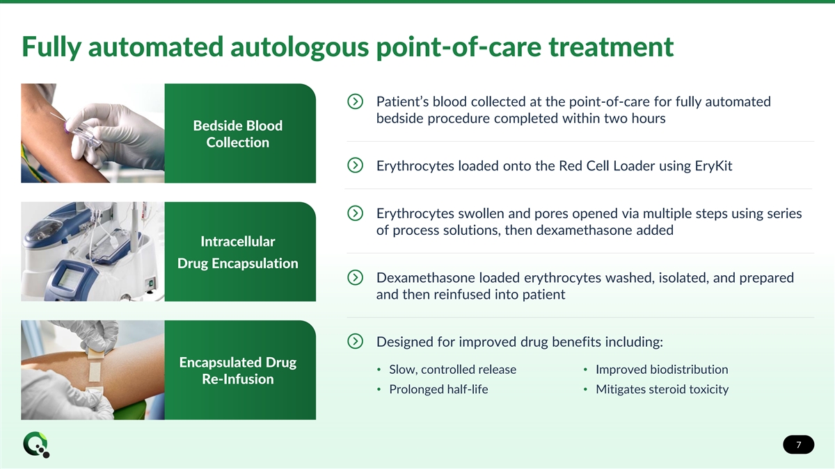 Autologous intracellular drug encapsulation (AIDE) technology Unique drug/device combination enables automated process for autologous intracellular drug encapsulation Platform capable of expansion to other drugs or biologics, including enzyme replacement therapy 6
