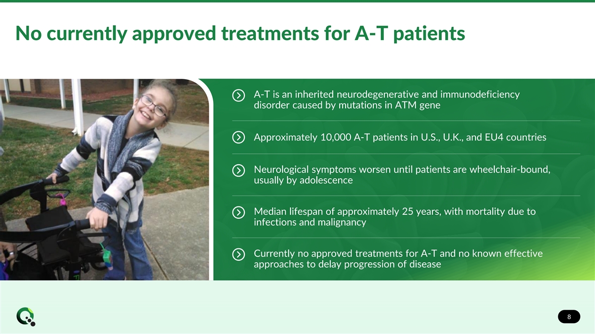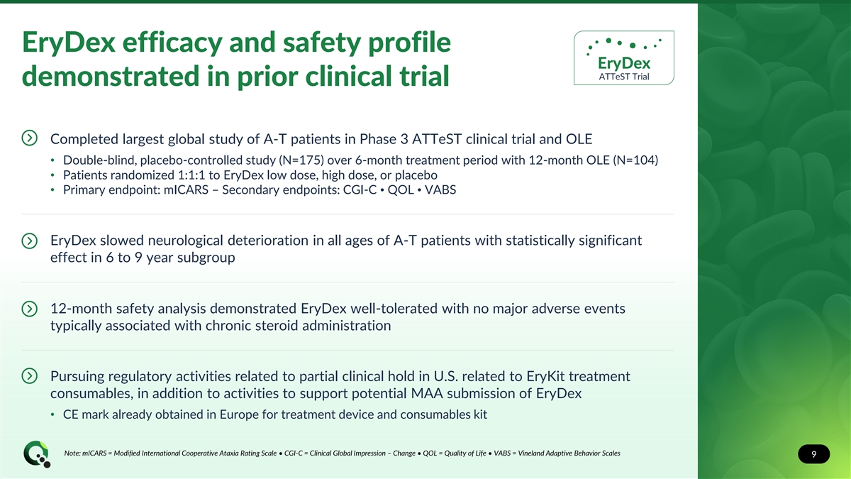 No currently approved treatments for A-T patients A-T is an inherited neurodegenerative and immunodeficiency disorder caused by mutations in ATM gene Approximately 10,000 A-T patients in U.S., U.K., and EU4 countries Neurological symptoms worsen until patients are wheelchair-bound, usually by adolescence Median lifespan of approximately 25 years, with mortality due to infections and malignancy Currently no approved treatments for A-T and no known effective approaches to delay progression of disease 8