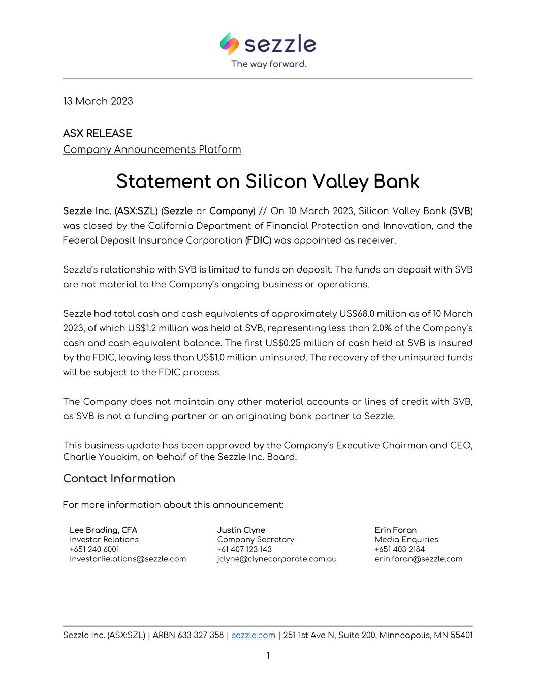 Sezzle Inc. (ASX:SZL) | ARBN 633 327 358 | sezzle.com | 251 1st Ave N, Suite 200, Minneapolis, MN 55401 1 13 March 2023 ASX RELEASE Company Announcements Platform Statement on Silicon Valley Bank Sezzle Inc. (ASX:SZL) (Sezzle or Company) // On 10 March 2023, Silicon Valley Bank (SVB) was closed by the California Department of Financial Protection and Innovation, and the Federal Deposit Insurance Corporation (FDIC) was appointed as receiver. Sezzle’s relationship with SVB is limited to funds on deposit. The funds on deposit with SVB are not material to the Company’s ongoing business or operations. Sezzle had total cash and cash equivalents of approximately US$68.0 million as of 10 March 2023, of which US$1.2 million was held at SVB, representing less than 2.0% of the Company’s cash and cash equivalent balance. The first US$0.25 million of cash held at SVB is insured by the FDIC, leaving less than US$1.0 million uninsured. The recovery of the uninsured funds will be subject to the FDIC process. The Company does not maintain any other material accounts or lines of credit with SVB, as SVB is not a funding partner or an originating bank partner to Sezzle. This business update has been approved by the Company’s Executive Chairman and CEO, Charlie Youakim, on behalf of the Sezzle Inc. Board. Contact Information For more information about this announcement: Lee Brading, CFA Investor Relations +651 240 6001 InvestorRelations@sezzle.com Justin Clyne Company Secretary +61 407 123 143 jclyne@clynecorporate.com.au Erin Foran Media Enquiries +651 403 2184 erin.foran@sezzle.com