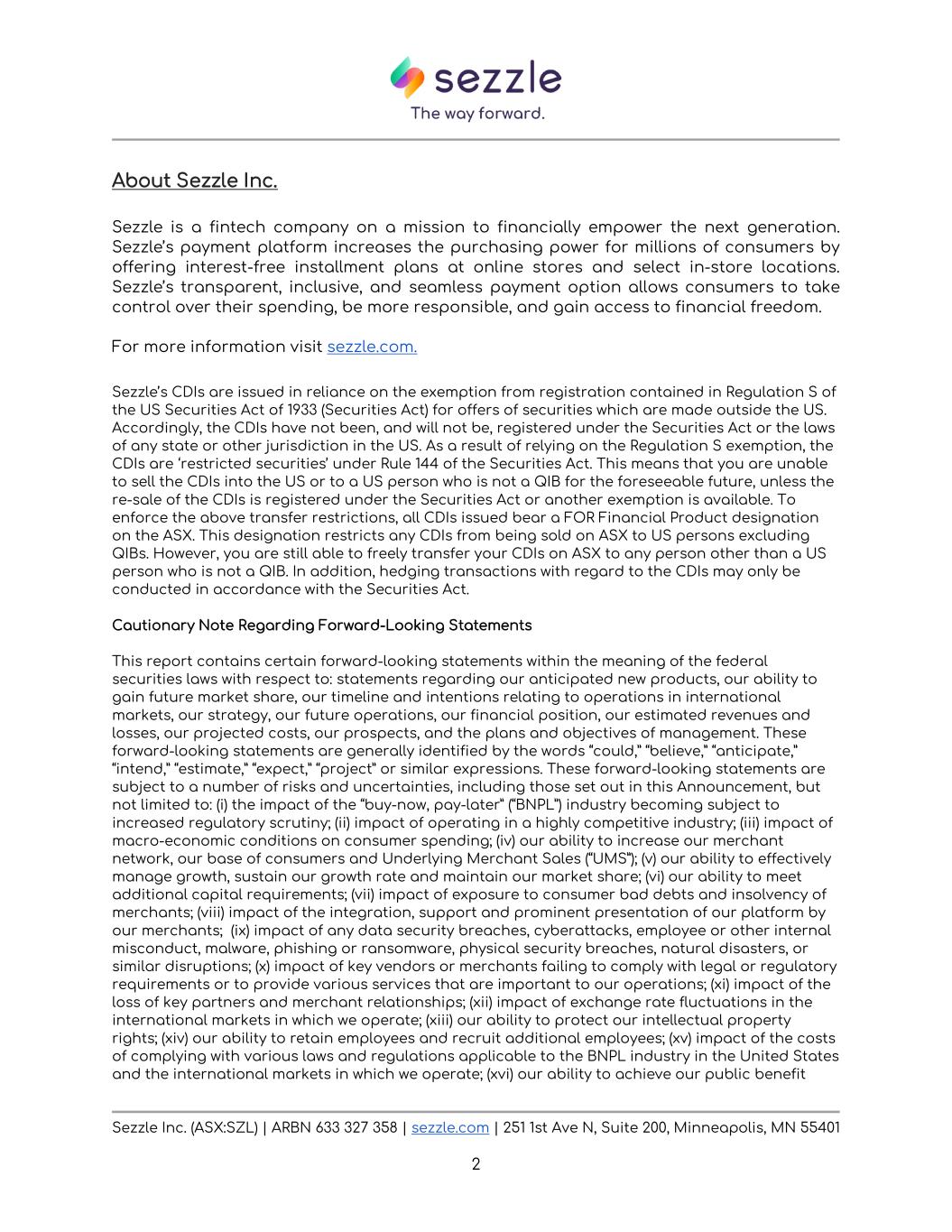 Sezzle Inc. (ASX:SZL) | ARBN 633 327 358 | sezzle.com | 251 1st Ave N, Suite 200, Minneapolis, MN 55401 2 About Sezzle Inc. Sezzle is a fintech company on a mission to financially empower the next generation. Sezzle’s payment platform increases the purchasing power for millions of consumers by offering interest-free installment plans at online stores and select in-store locations. Sezzle’s transparent, inclusive, and seamless payment option allows consumers to take control over their spending, be more responsible, and gain access to financial freedom. For more information visit sezzle.com. Sezzle’s CDIs are issued in reliance on the exemption from registration contained in Regulation S of the US Securities Act of 1933 (Securities Act) for offers of securities which are made outside the US. Accordingly, the CDIs have not been, and will not be, registered under the Securities Act or the laws of any state or other jurisdiction in the US. As a result of relying on the Regulation S exemption, the CDIs are ‘restricted securities’ under Rule 144 of the Securities Act. This means that you are unable to sell the CDIs into the US or to a US person who is not a QIB for the foreseeable future, unless the re-sale of the CDIs is registered under the Securities Act or another exemption is available. To enforce the above transfer restrictions, all CDIs issued bear a FOR Financial Product designation on the ASX. This designation restricts any CDIs from being sold on ASX to US persons excluding QIBs. However, you are still able to freely transfer your CDIs on ASX to any person other than a US person who is not a QIB. In addition, hedging transactions with regard to the CDIs may only be conducted in accordance with the Securities Act. Cautionary Note Regarding Forward-Looking Statements This report contains certain forward-looking statements within the meaning of the federal securities laws with respect to: statements regarding our anticipated new products, our ability to gain future market share, our timeline and intentions relating to operations in international markets, our strategy, our future operations, our financial position, our estimated revenues and losses, our projected costs, our prospects, and the plans and objectives of management. These forward-looking statements are generally identified by the words “could,” “believe,” “anticipate,” “intend,” “estimate,” “expect,” “project” or similar expressions. These forward-looking statements are subject to a number of risks and uncertainties, including those set out in this Announcement, but not limited to: (i) the impact of the “buy-now, pay-later” (“BNPL”) industry becoming subject to increased regulatory scrutiny; (ii) impact of operating in a highly competitive industry; (iii) impact of macro-economic conditions on consumer spending; (iv) our ability to increase our merchant network, our base of consumers and Underlying Merchant Sales (“UMS”); (v) our ability to effectively manage growth, sustain our growth rate and maintain our market share; (vi) our ability to meet additional capital requirements; (vii) impact of exposure to consumer bad debts and insolvency of merchants; (viii) impact of the integration, support and prominent presentation of our platform by our merchants; (ix) impact of any data security breaches, cyberattacks, employee or other internal misconduct, malware, phishing or ransomware, physical security breaches, natural disasters, or similar disruptions; (x) impact of key vendors or merchants failing to comply with legal or regulatory requirements or to provide various services that are important to our operations; (xi) impact of the loss of key partners and merchant relationships; (xii) impact of exchange rate fluctuations in the international markets in which we operate; (xiii) our ability to protect our intellectual property rights; (xiv) our ability to retain employees and recruit additional employees; (xv) impact of the costs of complying with various laws and regulations applicable to the BNPL industry in the United States and the international markets in which we operate; (xvi) our ability to achieve our public benefit