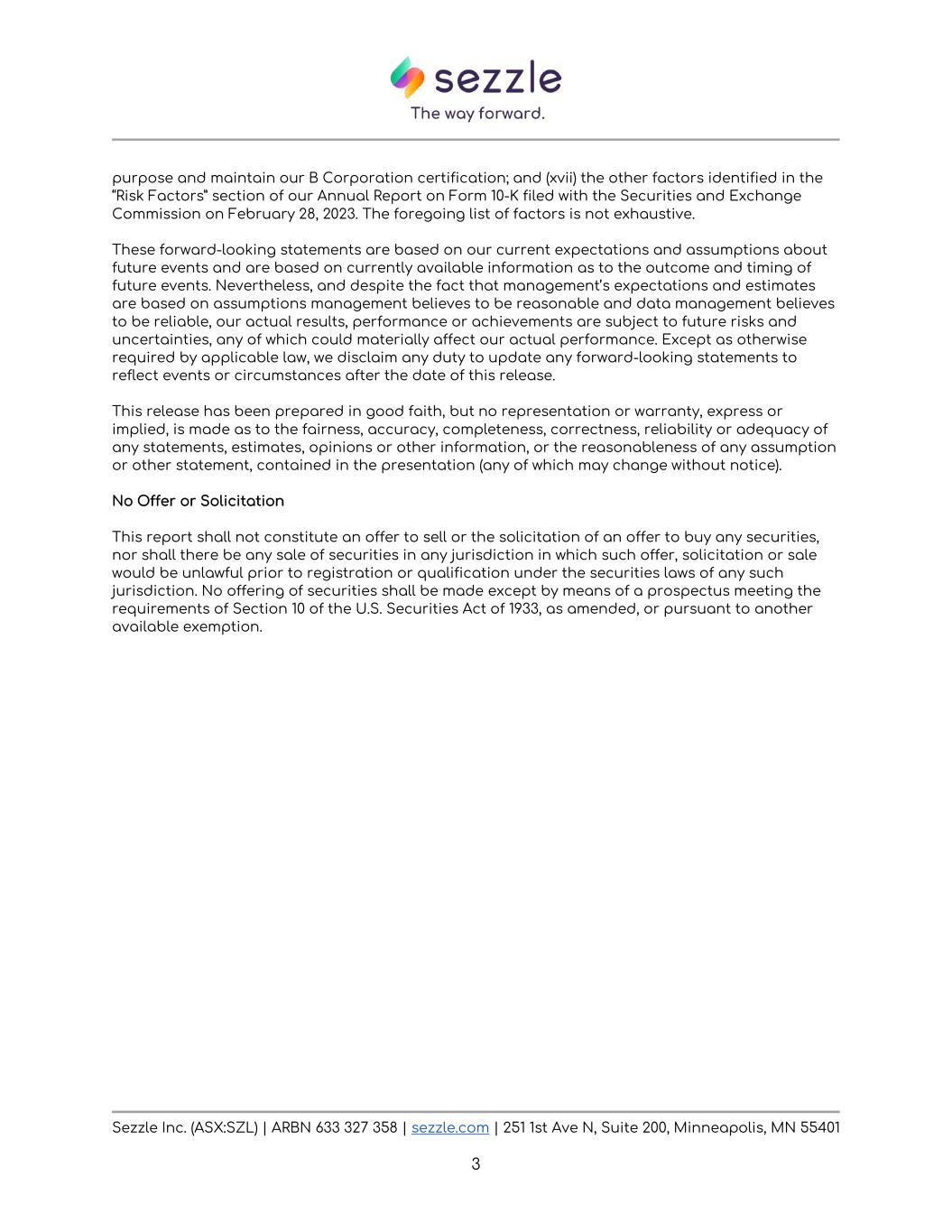 Sezzle Inc. (ASX:SZL) | ARBN 633 327 358 | sezzle.com | 251 1st Ave N, Suite 200, Minneapolis, MN 55401 3 purpose and maintain our B Corporation certification; and (xvii) the other factors identified in the “Risk Factors” section of our Annual Report on Form 10-K filed with the Securities and Exchange Commission on February 28, 2023. The foregoing list of factors is not exhaustive. These forward-looking statements are based on our current expectations and assumptions about future events and are based on currently available information as to the outcome and timing of future events. Nevertheless, and despite the fact that management’s expectations and estimates are based on assumptions management believes to be reasonable and data management believes to be reliable, our actual results, performance or achievements are subject to future risks and uncertainties, any of which could materially affect our actual performance. Except as otherwise required by applicable law, we disclaim any duty to update any forward-looking statements to reflect events or circumstances after the date of this release. This release has been prepared in good faith, but no representation or warranty, express or implied, is made as to the fairness, accuracy, completeness, correctness, reliability or adequacy of any statements, estimates, opinions or other information, or the reasonableness of any assumption or other statement, contained in the presentation (any of which may change without notice). No Offer or Solicitation This report shall not constitute an offer to sell or the solicitation of an offer to buy any securities, nor shall there be any sale of securities in any jurisdiction in which such offer, solicitation or sale would be unlawful prior to registration or qualification under the securities laws of any such jurisdiction. No offering of securities shall be made except by means of a prospectus meeting the requirements of Section 10 of the U.S. Securities Act of 1933, as amended, or pursuant to another available exemption.