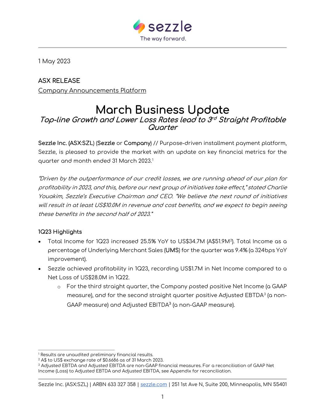 Sezzle Inc. (ASX:SZL) | ARBN 633 327 358 | sezzle.com | 251 1st Ave N, Suite 200, Minneapolis, MN 55401 1 1 May 2023 ASX RELEASE Company Announcements Platform March Business Update Top-line Growth and Lower Loss Rates lead to 3rd Straight Profitable Quarter Sezzle Inc. (ASX:SZL) (Sezzle or Company) // Purpose-driven installment payment platform, Sezzle, is pleased to provide the market with an update on key financial metrics for the quarter and month ended 31 March 2023.1 “Driven by the outperformance of our credit losses, we are running ahead of our plan for profitability in 2023, and this, before our next group of initiatives take effect,” stated Charlie Youakim, Sezzle’s Executive Chairman and CEO. “We believe the next round of initiatives will result in at least US$10.0M in revenue and cost benefits, and we expect to begin seeing these benefits in the second half of 2023.” 1Q23 Highlights • Total Income for 1Q23 increased 25.5% YoY to US$34.7M (A$51.9M2). Total Income as a percentage of Underlying Merchant Sales (UMS) for the quarter was 9.4% (a 324bps YoY improvement). • Sezzle achieved profitability in 1Q23, recording US$1.7M in Net Income compared to a Net Loss of US$28.0M in 1Q22. o For the third straight quarter, the Company posted positive Net Income (a GAAP measure), and for the second straight quarter positive Adjusted EBTDA3 (a non- GAAP measure) and Adjusted EBITDA3 (a non-GAAP measure). 1 Results are unaudited preliminary financial results. 2 A$ to US$ exchange rate of $0.6686 as of 31 March 2023. 3 Adjusted EBTDA and Adjusted EBITDA are non-GAAP financial measures. For a reconciliation of GAAP Net Income (Loss) to Adjusted EBTDA and Adjusted EBITDA, see Appendix for reconciliation.