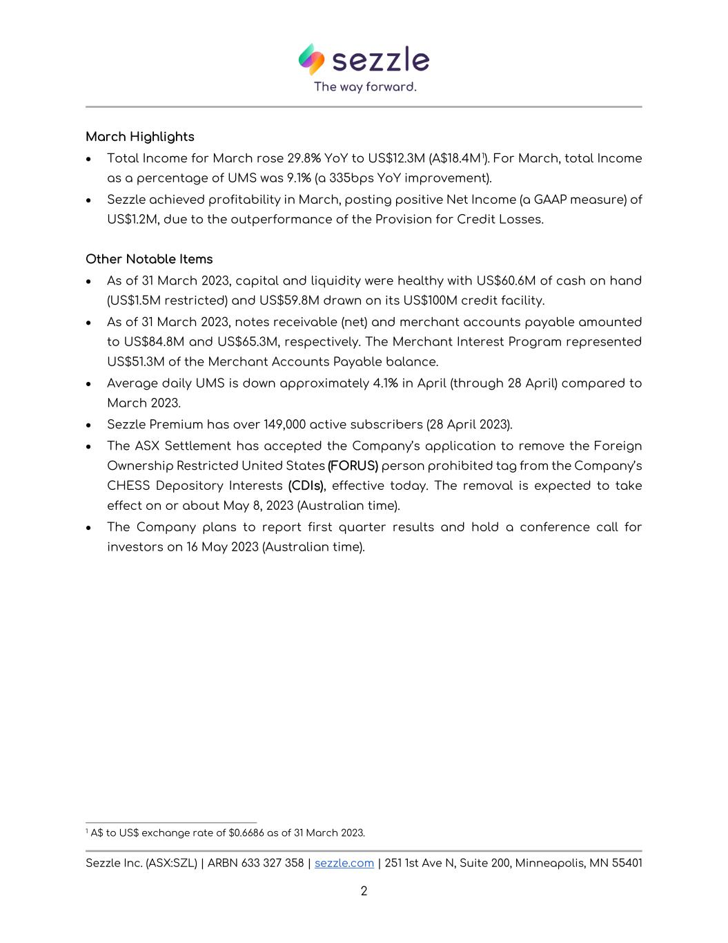 Sezzle Inc. (ASX:SZL) | ARBN 633 327 358 | sezzle.com | 251 1st Ave N, Suite 200, Minneapolis, MN 55401 2 March Highlights • Total Income for March rose 29.8% YoY to US$12.3M (A$18.4M1). For March, total Income as a percentage of UMS was 9.1% (a 335bps YoY improvement). • Sezzle achieved profitability in March, posting positive Net Income (a GAAP measure) of US$1.2M, due to the outperformance of the Provision for Credit Losses. Other Notable Items • As of 31 March 2023, capital and liquidity were healthy with US$60.6M of cash on hand (US$1.5M restricted) and US$59.8M drawn on its US$100M credit facility. • As of 31 March 2023, notes receivable (net) and merchant accounts payable amounted to US$84.8M and US$65.3M, respectively. The Merchant Interest Program represented US$51.3M of the Merchant Accounts Payable balance. • Average daily UMS is down approximately 4.1% in April (through 28 April) compared to March 2023. • Sezzle Premium has over 149,000 active subscribers (28 April 2023). • The ASX Settlement has accepted the Company’s application to remove the Foreign Ownership Restricted United States (FORUS) person prohibited tag from the Company’s CHESS Depository Interests (CDIs), effective today. The removal is expected to take effect on or about May 8, 2023 (Australian time). • The Company plans to report first quarter results and hold a conference call for investors on 16 May 2023 (Australian time). 1 A$ to US$ exchange rate of $0.6686 as of 31 March 2023.