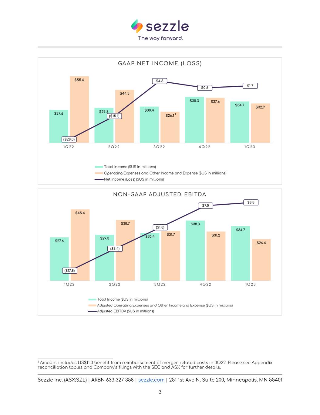 Sezzle Inc. (ASX:SZL) | ARBN 633 327 358 | sezzle.com | 251 1st Ave N, Suite 200, Minneapolis, MN 55401 3 1 1 Amount includes US$11.0 benefit from reimbursement of merger-related costs in 3Q22. Please see Appendix reconciliation tables and Company’s filings with the SEC and ASX for further details. 1