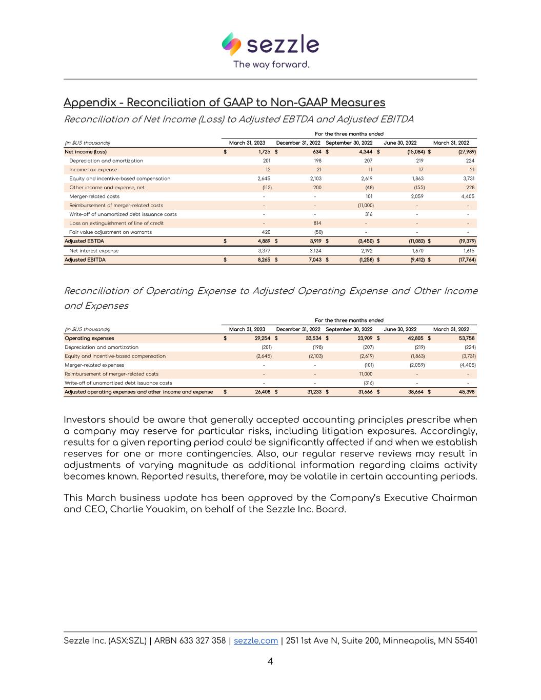 Sezzle Inc. (ASX:SZL) | ARBN 633 327 358 | sezzle.com | 251 1st Ave N, Suite 200, Minneapolis, MN 55401 4 Appendix - Reconciliation of GAAP to Non-GAAP Measures Reconciliation of Net Income (Loss) to Adjusted EBTDA and Adjusted EBITDA Reconciliation of Operating Expense to Adjusted Operating Expense and Other Income and Expenses Investors should be aware that generally accepted accounting principles prescribe when a company may reserve for particular risks, including litigation exposures. Accordingly, results for a given reporting period could be significantly affected if and when we establish reserves for one or more contingencies. Also, our regular reserve reviews may result in adjustments of varying magnitude as additional information regarding claims activity becomes known. Reported results, therefore, may be volatile in certain accounting periods. This March business update has been approved by the Company’s Executive Chairman and CEO, Charlie Youakim, on behalf of the Sezzle Inc. Board. For the three months ended (in $US thousands) March 31, 2023 December 31, 2022 September 30, 2022 June 30, 2022 March 31, 2022 Net income (loss) 1,725$ 634$ 4,344$ (15,084)$ (27,989)$ Depreciation and amortization 201 198 207 219 224 Income tax expense 12 21 11 17 21 Equity and incentive-based compensation 2,645 2,103 2,619 1,863 3,731 Other income and expense, net (113) 200 (48) (155) 228 Merger-related costs - - 101 2,059 4,405 Reimbursement of merger-related costs - - (11,000) - - Write-off of unamortized debt issuance costs - - 316 - - Loss on extinguishment of line of credit - 814 - - - Fair value adjustment on warrants 420 (50) - - - Adjusted EBTDA 4,889$ 3,919$ (3,450)$ (11,082)$ (19,379)$ Net interest expense 3,377 3,124 2,192 1,670 1,615 Adjusted EBITDA 8,265$ 7,043$ (1,258)$ (9,412)$ (17,764)$ For the three months ended (in $US thousands) March 31, 2023 December 31, 2022 September 30, 2022 June 30, 2022 March 31, 2022 Operating expenses 29,254$ 33,534$ 23,909$ 42,805$ 53,758$ Depreciation and amortization (201) (198) (207) (219) (224) Equity and incentive-based compensation (2,645) (2,103) (2,619) (1,863) (3,731) Merger-related expenses - - (101) (2,059) (4,405) Reimbursement of merger-related costs - - 11,000 - - Write-off of unamortized debt issuance costs - - (316) - - Adjusted operating expenses and other income and expense 26,408$ 31,233$ 31,666$ 38,664$ 45,398$