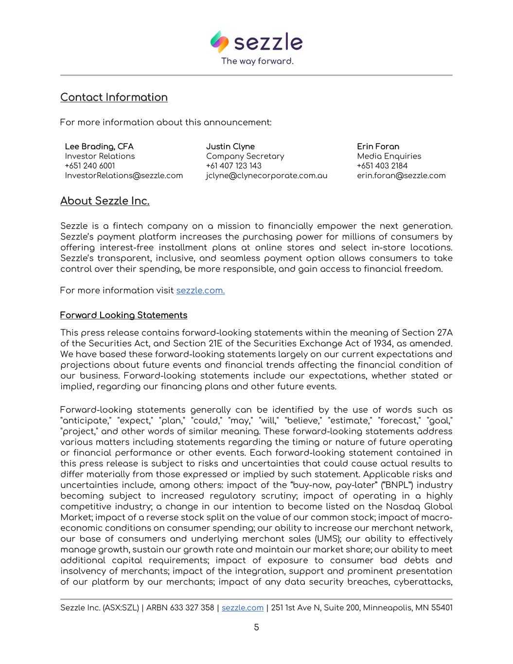 Sezzle Inc. (ASX:SZL) | ARBN 633 327 358 | sezzle.com | 251 1st Ave N, Suite 200, Minneapolis, MN 55401 5 Contact Information For more information about this announcement: About Sezzle Inc. Sezzle is a fintech company on a mission to financially empower the next generation. Sezzle’s payment platform increases the purchasing power for millions of consumers by offering interest-free installment plans at online stores and select in-store locations. Sezzle’s transparent, inclusive, and seamless payment option allows consumers to take control over their spending, be more responsible, and gain access to financial freedom. For more information visit sezzle.com. Forward Looking Statements This press release contains forward-looking statements within the meaning of Section 27A of the Securities Act, and Section 21E of the Securities Exchange Act of 1934, as amended. We have based these forward-looking statements largely on our current expectations and projections about future events and financial trends affecting the financial condition of our business. Forward-looking statements include our expectations, whether stated or implied, regarding our financing plans and other future events. Forward-looking statements generally can be identified by the use of words such as "anticipate," "expect," "plan," "could," "may," "will," "believe," "estimate," "forecast," "goal," "project," and other words of similar meaning. These forward-looking statements address various matters including statements regarding the timing or nature of future operating or financial performance or other events. Each forward-looking statement contained in this press release is subject to risks and uncertainties that could cause actual results to differ materially from those expressed or implied by such statement. Applicable risks and uncertainties include, among others: impact of the “buy-now, pay-later” (“BNPL”) industry becoming subject to increased regulatory scrutiny; impact of operating in a highly competitive industry; a change in our intention to become listed on the Nasdaq Global Market; impact of a reverse stock split on the value of our common stock; impact of macro- economic conditions on consumer spending; our ability to increase our merchant network, our base of consumers and underlying merchant sales (UMS); our ability to effectively manage growth, sustain our growth rate and maintain our market share; our ability to meet additional capital requirements; impact of exposure to consumer bad debts and insolvency of merchants; impact of the integration, support and prominent presentation of our platform by our merchants; impact of any data security breaches, cyberattacks, Lee Brading, CFA Investor Relations +651 240 6001 InvestorRelations@sezzle.com Justin Clyne Company Secretary +61 407 123 143 jclyne@clynecorporate.com.au Erin Foran Media Enquiries +651 403 2184 erin.foran@sezzle.com