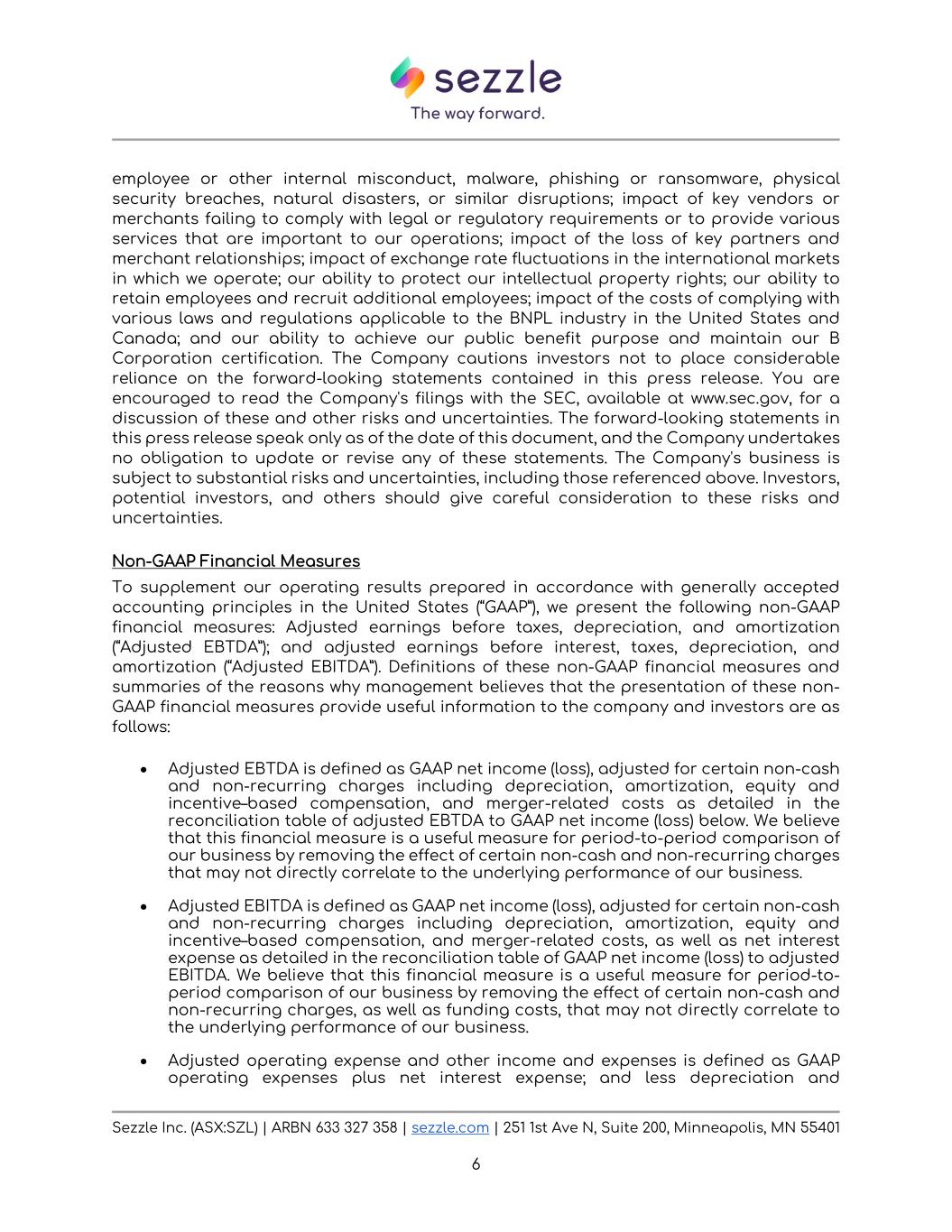 Sezzle Inc. (ASX:SZL) | ARBN 633 327 358 | sezzle.com | 251 1st Ave N, Suite 200, Minneapolis, MN 55401 6 employee or other internal misconduct, malware, phishing or ransomware, physical security breaches, natural disasters, or similar disruptions; impact of key vendors or merchants failing to comply with legal or regulatory requirements or to provide various services that are important to our operations; impact of the loss of key partners and merchant relationships; impact of exchange rate fluctuations in the international markets in which we operate; our ability to protect our intellectual property rights; our ability to retain employees and recruit additional employees; impact of the costs of complying with various laws and regulations applicable to the BNPL industry in the United States and Canada; and our ability to achieve our public benefit purpose and maintain our B Corporation certification. The Company cautions investors not to place considerable reliance on the forward-looking statements contained in this press release. You are encouraged to read the Company's filings with the SEC, available at www.sec.gov, for a discussion of these and other risks and uncertainties. The forward-looking statements in this press release speak only as of the date of this document, and the Company undertakes no obligation to update or revise any of these statements. The Company's business is subject to substantial risks and uncertainties, including those referenced above. Investors, potential investors, and others should give careful consideration to these risks and uncertainties. Non-GAAP Financial Measures To supplement our operating results prepared in accordance with generally accepted accounting principles in the United States (“GAAP”), we present the following non-GAAP financial measures: Adjusted earnings before taxes, depreciation, and amortization (“Adjusted EBTDA”); and adjusted earnings before interest, taxes, depreciation, and amortization (“Adjusted EBITDA”). Definitions of these non-GAAP financial measures and summaries of the reasons why management believes that the presentation of these non- GAAP financial measures provide useful information to the company and investors are as follows: • Adjusted EBTDA is defined as GAAP net income (loss), adjusted for certain non-cash and non-recurring charges including depreciation, amortization, equity and incentive–based compensation, and merger-related costs as detailed in the reconciliation table of adjusted EBTDA to GAAP net income (loss) below. We believe that this financial measure is a useful measure for period-to-period comparison of our business by removing the effect of certain non-cash and non-recurring charges that may not directly correlate to the underlying performance of our business. • Adjusted EBITDA is defined as GAAP net income (loss), adjusted for certain non-cash and non-recurring charges including depreciation, amortization, equity and incentive–based compensation, and merger-related costs, as well as net interest expense as detailed in the reconciliation table of GAAP net income (loss) to adjusted EBITDA. We believe that this financial measure is a useful measure for period-to- period comparison of our business by removing the effect of certain non-cash and non-recurring charges, as well as funding costs, that may not directly correlate to the underlying performance of our business. • Adjusted operating expense and other income and expenses is defined as GAAP operating expenses plus net interest expense; and less depreciation and