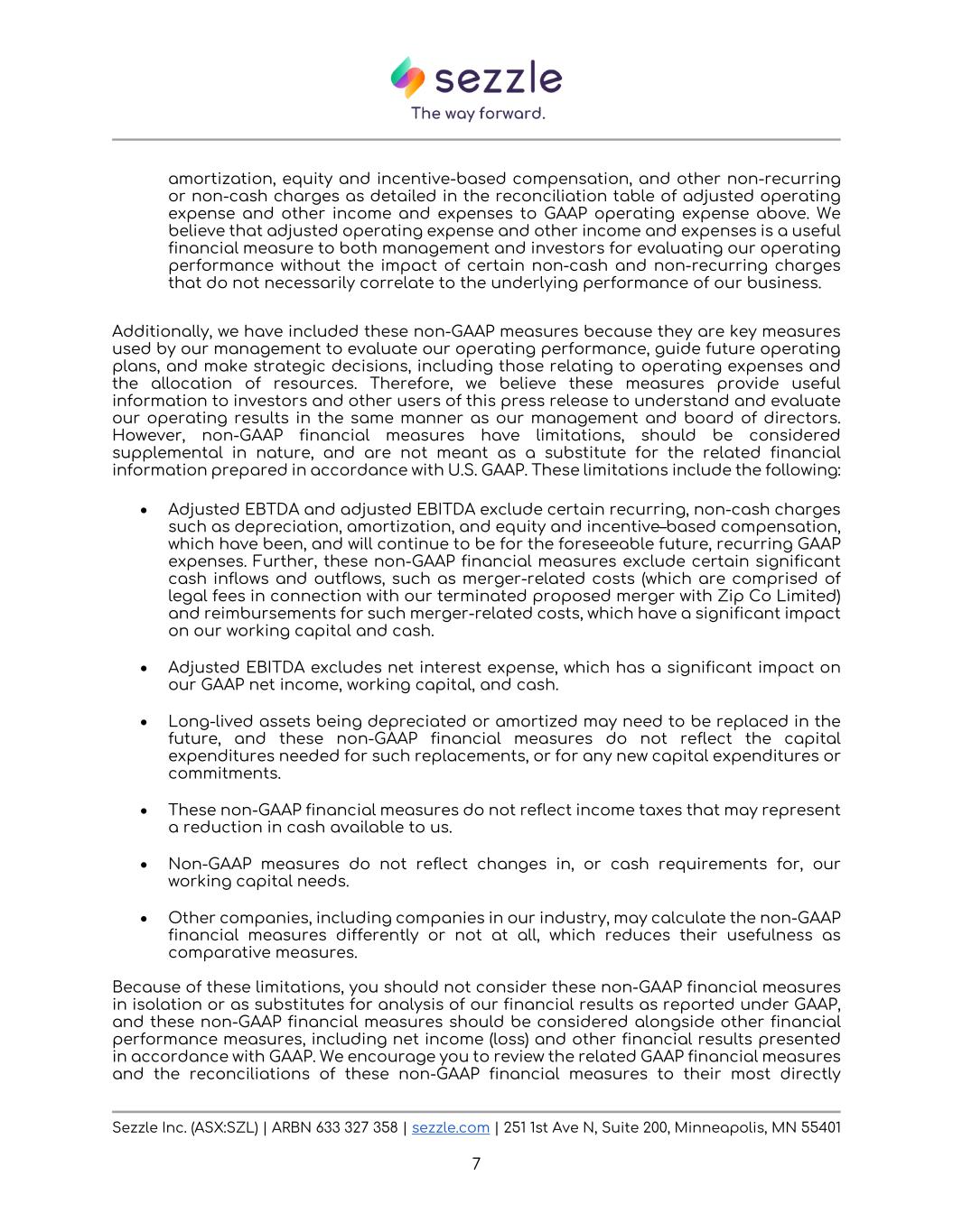 Sezzle Inc. (ASX:SZL) | ARBN 633 327 358 | sezzle.com | 251 1st Ave N, Suite 200, Minneapolis, MN 55401 7 amortization, equity and incentive-based compensation, and other non-recurring or non-cash charges as detailed in the reconciliation table of adjusted operating expense and other income and expenses to GAAP operating expense above. We believe that adjusted operating expense and other income and expenses is a useful financial measure to both management and investors for evaluating our operating performance without the impact of certain non-cash and non-recurring charges that do not necessarily correlate to the underlying performance of our business. Additionally, we have included these non-GAAP measures because they are key measures used by our management to evaluate our operating performance, guide future operating plans, and make strategic decisions, including those relating to operating expenses and the allocation of resources. Therefore, we believe these measures provide useful information to investors and other users of this press release to understand and evaluate our operating results in the same manner as our management and board of directors. However, non-GAAP financial measures have limitations, should be considered supplemental in nature, and are not meant as a substitute for the related financial information prepared in accordance with U.S. GAAP. These limitations include the following: • Adjusted EBTDA and adjusted EBITDA exclude certain recurring, non-cash charges such as depreciation, amortization, and equity and incentive–based compensation, which have been, and will continue to be for the foreseeable future, recurring GAAP expenses. Further, these non-GAAP financial measures exclude certain significant cash inflows and outflows, such as merger-related costs (which are comprised of legal fees in connection with our terminated proposed merger with Zip Co Limited) and reimbursements for such merger-related costs, which have a significant impact on our working capital and cash. ------------------------------------------------------------------ • Adjusted EBITDA excludes net interest expense, which has a significant impact on our GAAP net income, working capital, and cash. • Long-lived assets being depreciated or amortized may need to be replaced in the future, and these non-GAAP financial measures do not reflect the capital expenditures needed for such replacements, or for any new capital expenditures or commitments. • These non-GAAP financial measures do not reflect income taxes that may represent a reduction in cash available to us. • Non-GAAP measures do not reflect changes in, or cash requirements for, our working capital needs. -------------------------------------------------------------------------------- • Other companies, including companies in our industry, may calculate the non-GAAP financial measures differently or not at all, which reduces their usefulness as comparative measures. Because of these limitations, you should not consider these non-GAAP financial measures in isolation or as substitutes for analysis of our financial results as reported under GAAP, and these non-GAAP financial measures should be considered alongside other financial performance measures, including net income (loss) and other financial results presented in accordance with GAAP. We encourage you to review the related GAAP financial measures and the reconciliations of these non-GAAP financial measures to their most directly