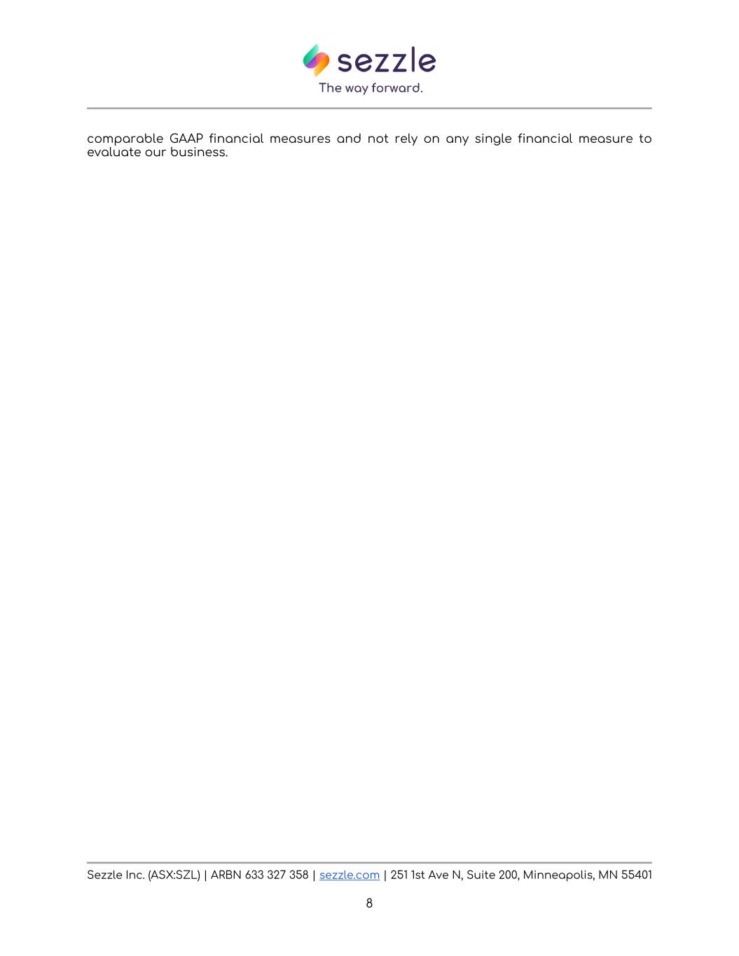 Sezzle Inc. (ASX:SZL) | ARBN 633 327 358 | sezzle.com | 251 1st Ave N, Suite 200, Minneapolis, MN 55401 8 comparable GAAP financial measures and not rely on any single financial measure to evaluate our business.