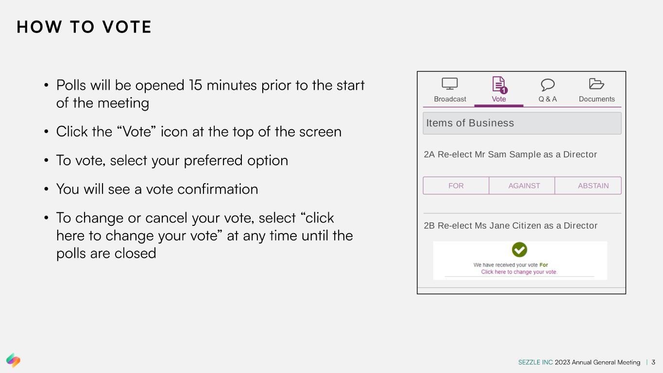• • • • • Items of Business 2A Re-elect Mr Sam Sample as a Director FOR AGAINST ABSTAIN 2B Re-elect Ms Jane Citizen as a Director