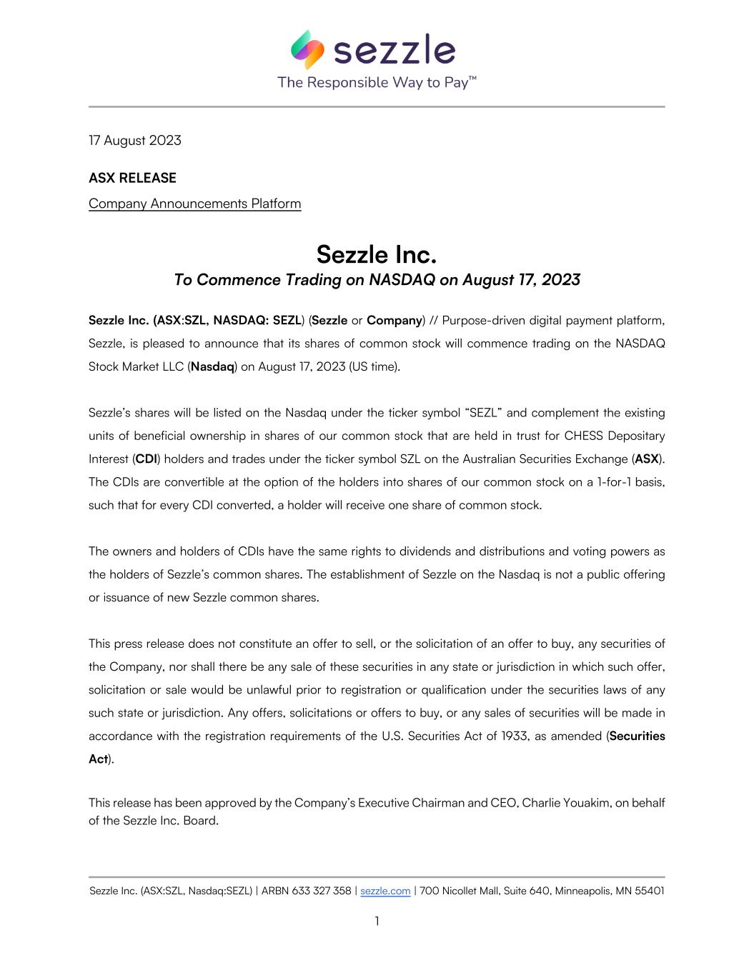 Sezzle Inc. (ASX:SZL, Nasdaq:SEZL) | ARBN 633 327 358 | sezzle.com | 700 Nicollet Mall, Suite 640, Minneapolis, MN 55401 1 17 August 2023 ASX RELEASE Company Announcements Platform Sezzle Inc. To Commence Trading on NASDAQ on August 17, 2023 Sezzle Inc. (ASX:SZL, NASDAQ: SEZL) (Sezzle or Company) // Purpose-driven digital payment platform, Sezzle, is pleased to announce that its shares of common stock will commence trading on the NASDAQ Stock Market LLC (Nasdaq) on August 17, 2023 (US time). Sezzle’s shares will be listed on the Nasdaq under the ticker symbol “SEZL” and complement the existing units of beneficial ownership in shares of our common stock that are held in trust for CHESS Depositary Interest (CDI) holders and trades under the ticker symbol SZL on the Australian Securities Exchange (ASX). The CDIs are convertible at the option of the holders into shares of our common stock on a 1-for-1 basis, such that for every CDI converted, a holder will receive one share of common stock. The owners and holders of CDIs have the same rights to dividends and distributions and voting powers as the holders of Sezzle’s common shares. The establishment of Sezzle on the Nasdaq is not a public offering or issuance of new Sezzle common shares. This press release does not constitute an offer to sell, or the solicitation of an offer to buy, any securities of the Company, nor shall there be any sale of these securities in any state or jurisdiction in which such offer, solicitation or sale would be unlawful prior to registration or qualification under the securities laws of any such state or jurisdiction. Any offers, solicitations or offers to buy, or any sales of securities will be made in accordance with the registration requirements of the U.S. Securities Act of 1933, as amended (Securities Act). This release has been approved by the Company’s Executive Chairman and CEO, Charlie Youakim, on behalf of the Sezzle Inc. Board.
