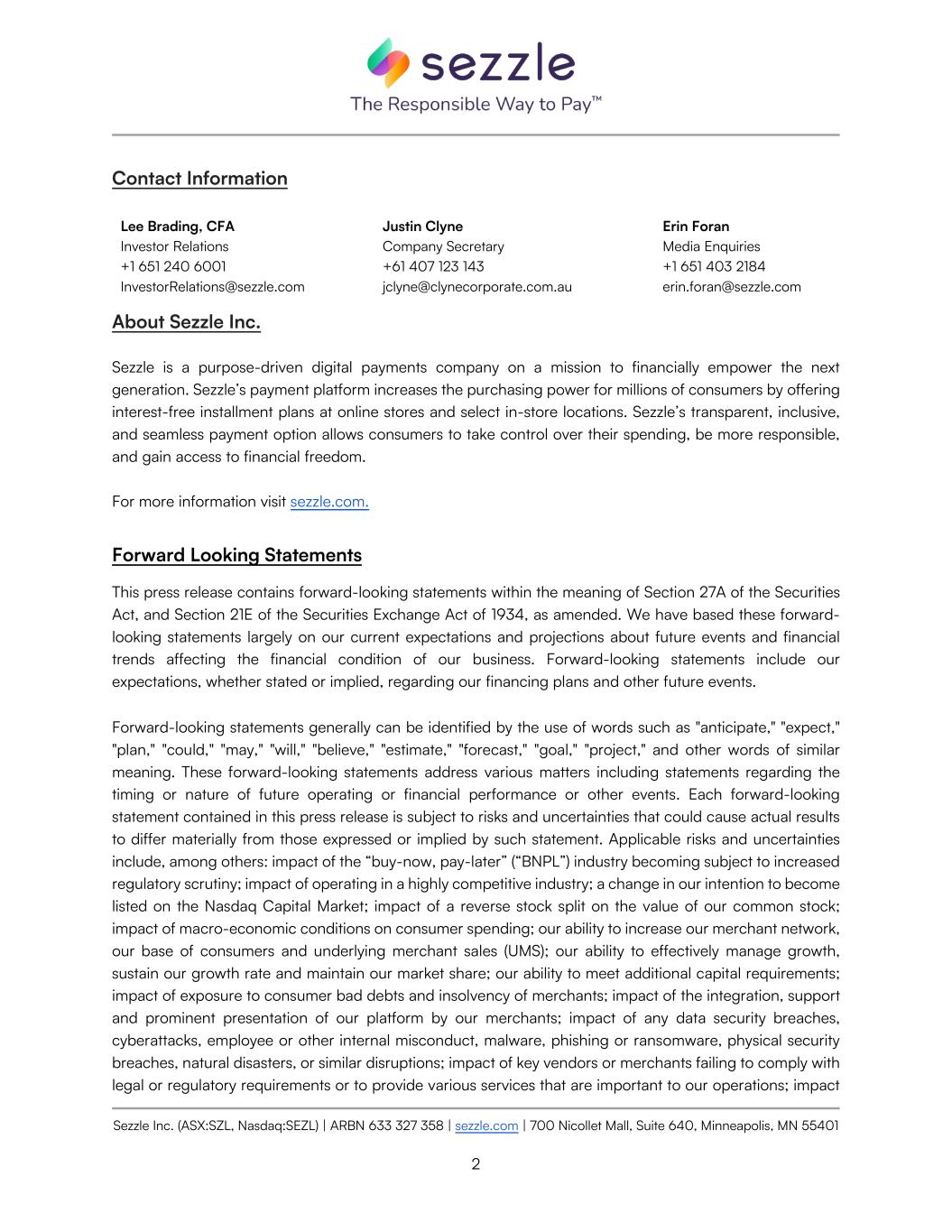 Sezzle Inc. (ASX:SZL, Nasdaq:SEZL) | ARBN 633 327 358 | sezzle.com | 700 Nicollet Mall, Suite 640, Minneapolis, MN 55401 2 Contact Information About Sezzle Inc. Sezzle is a purpose-driven digital payments company on a mission to financially empower the next generation. Sezzle’s payment platform increases the purchasing power for millions of consumers by offering interest-free installment plans at online stores and select in-store locations. Sezzle’s transparent, inclusive, and seamless payment option allows consumers to take control over their spending, be more responsible, and gain access to financial freedom. For more information visit sezzle.com. Forward Looking Statements This press release contains forward-looking statements within the meaning of Section 27A of the Securities Act, and Section 21E of the Securities Exchange Act of 1934, as amended. We have based these forward- looking statements largely on our current expectations and projections about future events and financial trends affecting the financial condition of our business. Forward-looking statements include our expectations, whether stated or implied, regarding our financing plans and other future events. Forward-looking statements generally can be identified by the use of words such as "anticipate," "expect," "plan," "could," "may," "will," "believe," "estimate," "forecast," "goal," "project," and other words of similar meaning. These forward-looking statements address various matters including statements regarding the timing or nature of future operating or financial performance or other events. Each forward-looking statement contained in this press release is subject to risks and uncertainties that could cause actual results to differ materially from those expressed or implied by such statement. Applicable risks and uncertainties include, among others: impact of the “buy-now, pay-later” (“BNPL”) industry becoming subject to increased regulatory scrutiny; impact of operating in a highly competitive industry; a change in our intention to become listed on the Nasdaq Capital Market; impact of a reverse stock split on the value of our common stock; impact of macro-economic conditions on consumer spending; our ability to increase our merchant network, our base of consumers and underlying merchant sales (UMS); our ability to effectively manage growth, sustain our growth rate and maintain our market share; our ability to meet additional capital requirements; impact of exposure to consumer bad debts and insolvency of merchants; impact of the integration, support and prominent presentation of our platform by our merchants; impact of any data security breaches, cyberattacks, employee or other internal misconduct, malware, phishing or ransomware, physical security breaches, natural disasters, or similar disruptions; impact of key vendors or merchants failing to comply with legal or regulatory requirements or to provide various services that are important to our operations; impact Lee Brading, CFA Investor Relations +1 651 240 6001 InvestorRelations@sezzle.com Justin Clyne Company Secretary +61 407 123 143 jclyne@clynecorporate.com.au Erin Foran Media Enquiries +1 651 403 2184 erin.foran@sezzle.com