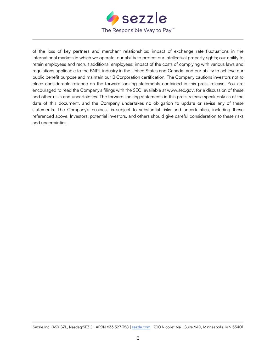 Sezzle Inc. (ASX:SZL, Nasdaq:SEZL) | ARBN 633 327 358 | sezzle.com | 700 Nicollet Mall, Suite 640, Minneapolis, MN 55401 3 of the loss of key partners and merchant relationships; impact of exchange rate fluctuations in the international markets in which we operate; our ability to protect our intellectual property rights; our ability to retain employees and recruit additional employees; impact of the costs of complying with various laws and regulations applicable to the BNPL industry in the United States and Canada; and our ability to achieve our public benefit purpose and maintain our B Corporation certification. The Company cautions investors not to place considerable reliance on the forward-looking statements contained in this press release. You are encouraged to read the Company's filings with the SEC, available at www.sec.gov, for a discussion of these and other risks and uncertainties. The forward-looking statements in this press release speak only as of the date of this document, and the Company undertakes no obligation to update or revise any of these statements. The Company's business is subject to substantial risks and uncertainties, including those referenced above. Investors, potential investors, and others should give careful consideration to these risks and uncertainties.