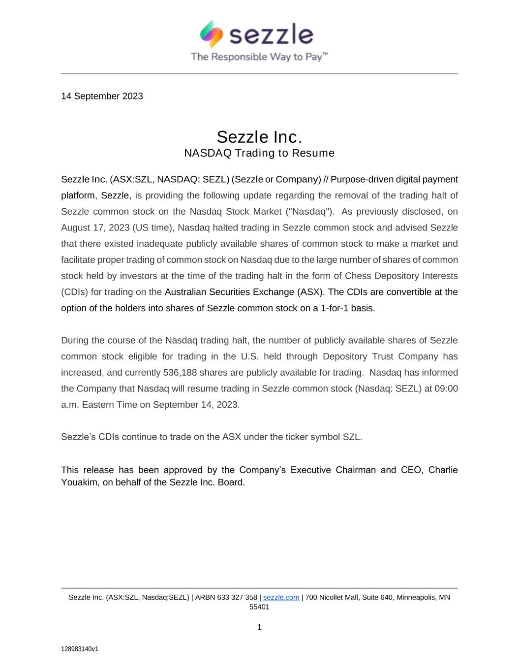 128983140v1 Sezzle Inc. (ASX:SZL, Nasdaq:SEZL) | ARBN 633 327 358 | sezzle.com | 700 Nicollet Mall, Suite 640, Minneapolis, MN 55401 1 14 September 2023 Sezzle Inc. NASDAQ Trading to Resume Sezzle Inc. (ASX:SZL, NASDAQ: SEZL) (Sezzle or Company) // Purpose-driven digital payment platform, Sezzle, is providing the following update regarding the removal of the trading halt of Sezzle common stock on the Nasdaq Stock Market ("Nasdaq"). As previously disclosed, on August 17, 2023 (US time), Nasdaq halted trading in Sezzle common stock and advised Sezzle that there existed inadequate publicly available shares of common stock to make a market and facilitate proper trading of common stock on Nasdaq due to the large number of shares of common stock held by investors at the time of the trading halt in the form of Chess Depository Interests (CDIs) for trading on the Australian Securities Exchange (ASX). The CDIs are convertible at the option of the holders into shares of Sezzle common stock on a 1-for-1 basis. During the course of the Nasdaq trading halt, the number of publicly available shares of Sezzle common stock eligible for trading in the U.S. held through Depository Trust Company has increased, and currently 536,188 shares are publicly available for trading. Nasdaq has informed the Company that Nasdaq will resume trading in Sezzle common stock (Nasdaq: SEZL) at 09:00 a.m. Eastern Time on September 14, 2023. Sezzle’s CDIs continue to trade on the ASX under the ticker symbol SZL. This release has been approved by the Company’s Executive Chairman and CEO, Charlie Youakim, on behalf of the Sezzle Inc. Board.