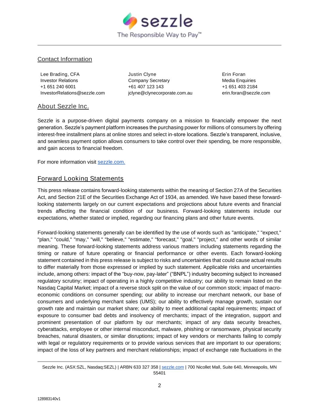 128983140v1 Sezzle Inc. (ASX:SZL, Nasdaq:SEZL) | ARBN 633 327 358 | sezzle.com | 700 Nicollet Mall, Suite 640, Minneapolis, MN 55401 2 Contact Information About Sezzle Inc. Sezzle is a purpose-driven digital payments company on a mission to financially empower the next generation. Sezzle’s payment platform increases the purchasing power for millions of consumers by offering interest-free installment plans at online stores and select in-store locations. Sezzle’s transparent, inclusive, and seamless payment option allows consumers to take control over their spending, be more responsible, and gain access to financial freedom. For more information visit sezzle.com. Forward Looking Statements This press release contains forward-looking statements within the meaning of Section 27A of the Securities Act, and Section 21E of the Securities Exchange Act of 1934, as amended. We have based these forward- looking statements largely on our current expectations and projections about future events and financial trends affecting the financial condition of our business. Forward-looking statements include our expectations, whether stated or implied, regarding our financing plans and other future events. Forward-looking statements generally can be identified by the use of words such as "anticipate," "expect," "plan," "could," "may," "will," "believe," "estimate," "forecast," "goal," "project," and other words of similar meaning. These forward-looking statements address various matters including statements regarding the timing or nature of future operating or financial performance or other events. Each forward-looking statement contained in this press release is subject to risks and uncertainties that could cause actual results to differ materially from those expressed or implied by such statement. Applicable risks and uncertainties include, among others: impact of the “buy-now, pay-later” (“BNPL”) industry becoming subject to increased regulatory scrutiny; impact of operating in a highly competitive industry; our ability to remain listed on the Nasdaq Capital Market; impact of a reverse stock split on the value of our common stock; impact of macro- economic conditions on consumer spending; our ability to increase our merchant network, our base of consumers and underlying merchant sales (UMS); our ability to effectively manage growth, sustain our growth rate and maintain our market share; our ability to meet additional capital requirements; impact of exposure to consumer bad debts and insolvency of merchants; impact of the integration, support and prominent presentation of our platform by our merchants; impact of any data security breaches, cyberattacks, employee or other internal misconduct, malware, phishing or ransomware, physical security breaches, natural disasters, or similar disruptions; impact of key vendors or merchants failing to comply with legal or regulatory requirements or to provide various services that are important to our operations; impact of the loss of key partners and merchant relationships; impact of exchange rate fluctuations in the Lee Brading, CFA Investor Relations +1 651 240 6001 InvestorRelations@sezzle.com Justin Clyne Company Secretary +61 407 123 143 jclyne@clynecorporate.com.au Erin Foran Media Enquiries +1 651 403 2184 erin.foran@sezzle.com