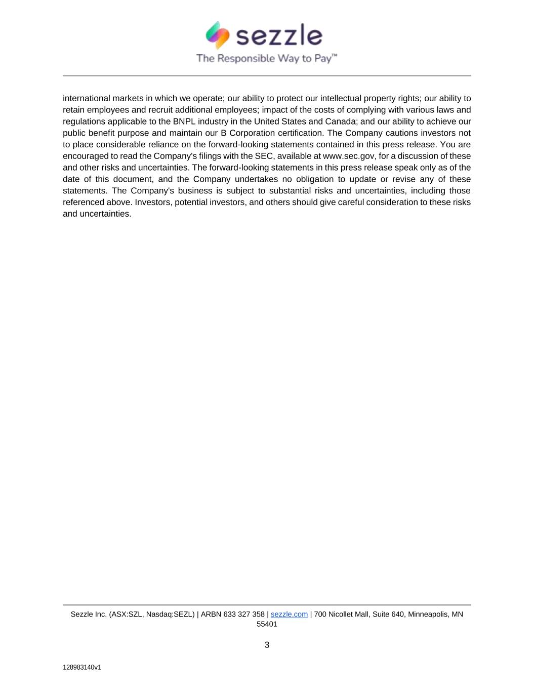128983140v1 Sezzle Inc. (ASX:SZL, Nasdaq:SEZL) | ARBN 633 327 358 | sezzle.com | 700 Nicollet Mall, Suite 640, Minneapolis, MN 55401 3 international markets in which we operate; our ability to protect our intellectual property rights; our ability to retain employees and recruit additional employees; impact of the costs of complying with various laws and regulations applicable to the BNPL industry in the United States and Canada; and our ability to achieve our public benefit purpose and maintain our B Corporation certification. The Company cautions investors not to place considerable reliance on the forward-looking statements contained in this press release. You are encouraged to read the Company's filings with the SEC, available at www.sec.gov, for a discussion of these and other risks and uncertainties. The forward-looking statements in this press release speak only as of the date of this document, and the Company undertakes no obligation to update or revise any of these statements. The Company's business is subject to substantial risks and uncertainties, including those referenced above. Investors, potential investors, and others should give careful consideration to these risks and uncertainties.