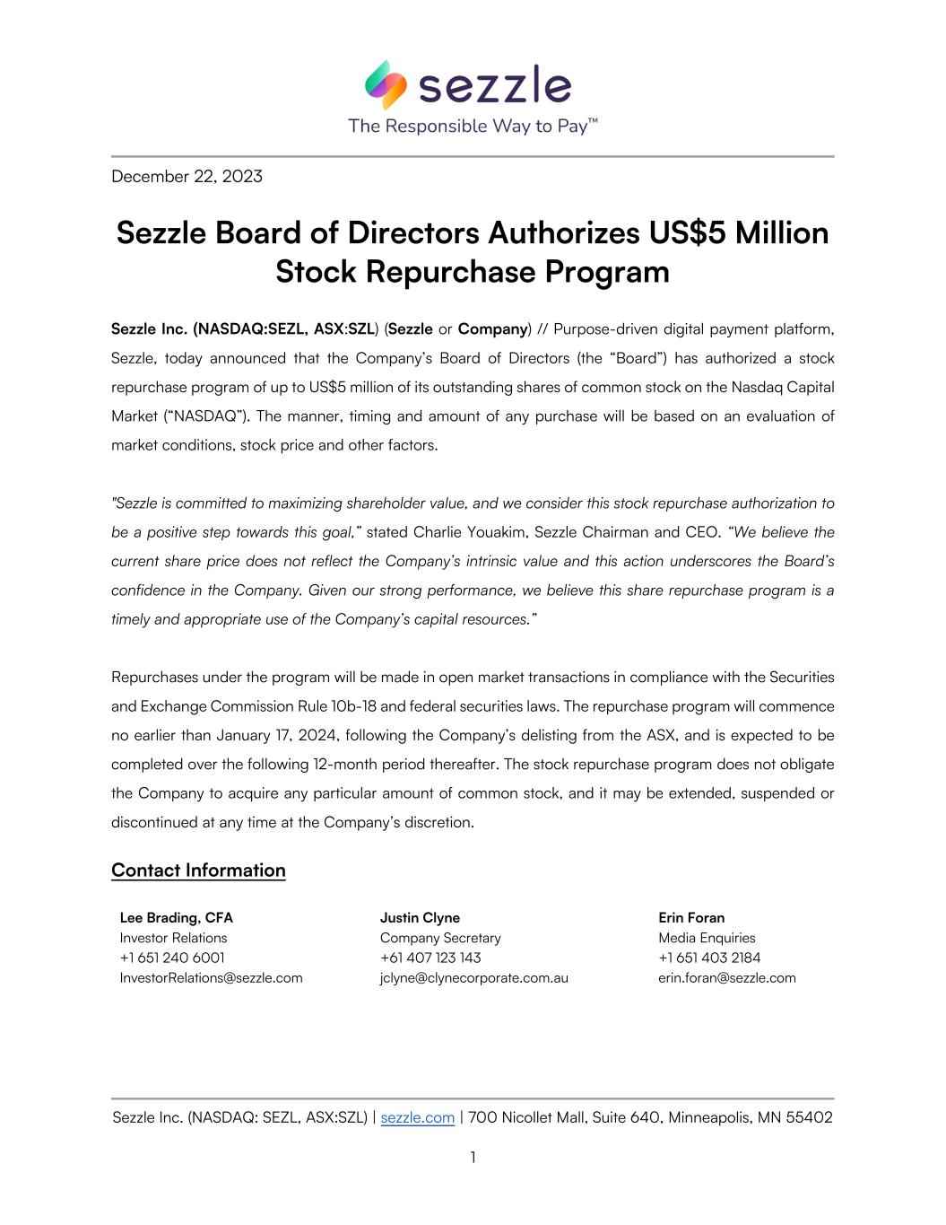 Sezzle Inc. (NASDAQ: SEZL, ASX:SZL) | sezzle.com | 700 Nicollet Mall, Suite 640, Minneapolis, MN 55402 1 December 22, 2023 Sezzle Board of Directors Authorizes US$5 Million Stock Repurchase Program Sezzle Inc. (NASDAQ:SEZL, ASX:SZL) (Sezzle or Company) // Purpose-driven digital payment platform, Sezzle, today announced that the Company’s Board of Directors (the “Board”) has authorized a stock repurchase program of up to US$5 million of its outstanding shares of common stock on the Nasdaq Capital Market (“NASDAQ”). The manner, timing and amount of any purchase will be based on an evaluation of market conditions, stock price and other factors. "Sezzle is committed to maximizing shareholder value, and we consider this stock repurchase authorization to be a positive step towards this goal,” stated Charlie Youakim, Sezzle Chairman and CEO. “We believe the current share price does not reflect the Company’s intrinsic value and this action underscores the Board’s confidence in the Company. Given our strong performance, we believe this share repurchase program is a timely and appropriate use of the Company’s capital resources.” Repurchases under the program will be made in open market transactions in compliance with the Securities and Exchange Commission Rule 10b-18 and federal securities laws. The repurchase program will commence no earlier than January 17, 2024, following the Company’s delisting from the ASX, and is expected to be completed over the following 12-month period thereafter. The stock repurchase program does not obligate the Company to acquire any particular amount of common stock, and it may be extended, suspended or discontinued at any time at the Company’s discretion. Contact Information Lee Brading, CFA Investor Relations +1 651 240 6001 InvestorRelations@sezzle.com Justin Clyne Company Secretary +61 407 123 143 jclyne@clynecorporate.com.au Erin Foran Media Enquiries +1 651 403 2184 erin.foran@sezzle.com