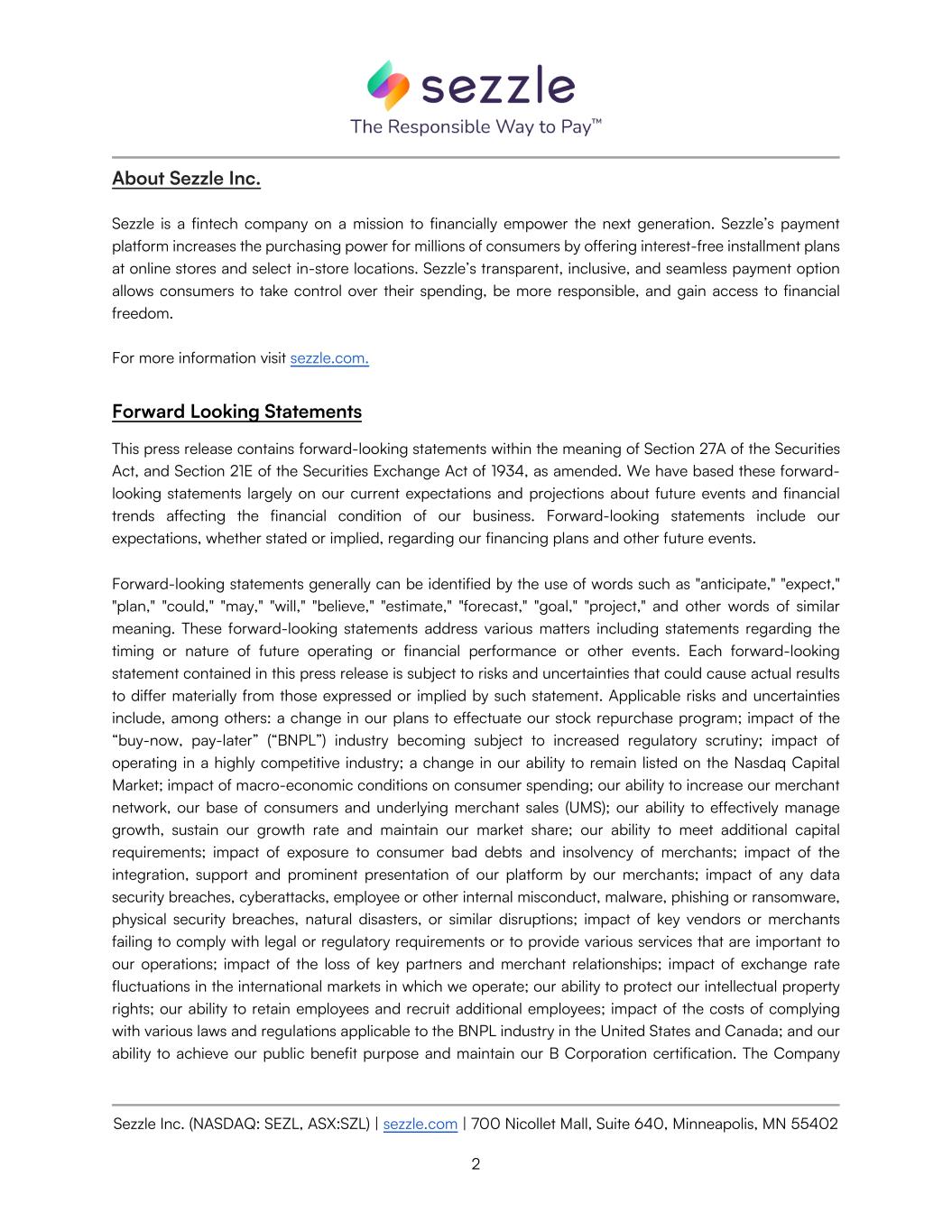 Sezzle Inc. (NASDAQ: SEZL, ASX:SZL) | sezzle.com | 700 Nicollet Mall, Suite 640, Minneapolis, MN 55402 2 About Sezzle Inc. Sezzle is a fintech company on a mission to financially empower the next generation. Sezzle’s payment platform increases the purchasing power for millions of consumers by offering interest-free installment plans at online stores and select in-store locations. Sezzle’s transparent, inclusive, and seamless payment option allows consumers to take control over their spending, be more responsible, and gain access to financial freedom. For more information visit sezzle.com. Forward Looking Statements This press release contains forward-looking statements within the meaning of Section 27A of the Securities Act, and Section 21E of the Securities Exchange Act of 1934, as amended. We have based these forward- looking statements largely on our current expectations and projections about future events and financial trends affecting the financial condition of our business. Forward-looking statements include our expectations, whether stated or implied, regarding our financing plans and other future events. Forward-looking statements generally can be identified by the use of words such as "anticipate," "expect," "plan," "could," "may," "will," "believe," "estimate," "forecast," "goal," "project," and other words of similar meaning. These forward-looking statements address various matters including statements regarding the timing or nature of future operating or financial performance or other events. Each forward-looking statement contained in this press release is subject to risks and uncertainties that could cause actual results to differ materially from those expressed or implied by such statement. Applicable risks and uncertainties include, among others: a change in our plans to effectuate our stock repurchase program; impact of the “buy-now, pay-later” (“BNPL”) industry becoming subject to increased regulatory scrutiny; impact of operating in a highly competitive industry; a change in our ability to remain listed on the Nasdaq Capital Market; impact of macro-economic conditions on consumer spending; our ability to increase our merchant network, our base of consumers and underlying merchant sales (UMS); our ability to effectively manage growth, sustain our growth rate and maintain our market share; our ability to meet additional capital requirements; impact of exposure to consumer bad debts and insolvency of merchants; impact of the integration, support and prominent presentation of our platform by our merchants; impact of any data security breaches, cyberattacks, employee or other internal misconduct, malware, phishing or ransomware, physical security breaches, natural disasters, or similar disruptions; impact of key vendors or merchants failing to comply with legal or regulatory requirements or to provide various services that are important to our operations; impact of the loss of key partners and merchant relationships; impact of exchange rate fluctuations in the international markets in which we operate; our ability to protect our intellectual property rights; our ability to retain employees and recruit additional employees; impact of the costs of complying with various laws and regulations applicable to the BNPL industry in the United States and Canada; and our ability to achieve our public benefit purpose and maintain our B Corporation certification. The Company