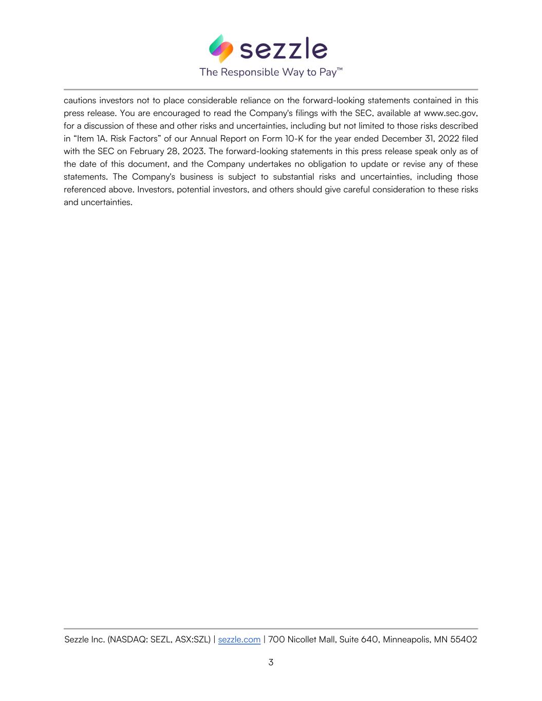 Sezzle Inc. (NASDAQ: SEZL, ASX:SZL) | sezzle.com | 700 Nicollet Mall, Suite 640, Minneapolis, MN 55402 3 cautions investors not to place considerable reliance on the forward-looking statements contained in this press release. You are encouraged to read the Company's filings with the SEC, available at www.sec.gov, for a discussion of these and other risks and uncertainties, including but not limited to those risks described in “Item 1A. Risk Factors” of our Annual Report on Form 10-K for the year ended December 31, 2022 filed with the SEC on February 28, 2023. The forward-looking statements in this press release speak only as of the date of this document, and the Company undertakes no obligation to update or revise any of these statements. The Company's business is subject to substantial risks and uncertainties, including those referenced above. Investors, potential investors, and others should give careful consideration to these risks and uncertainties.
