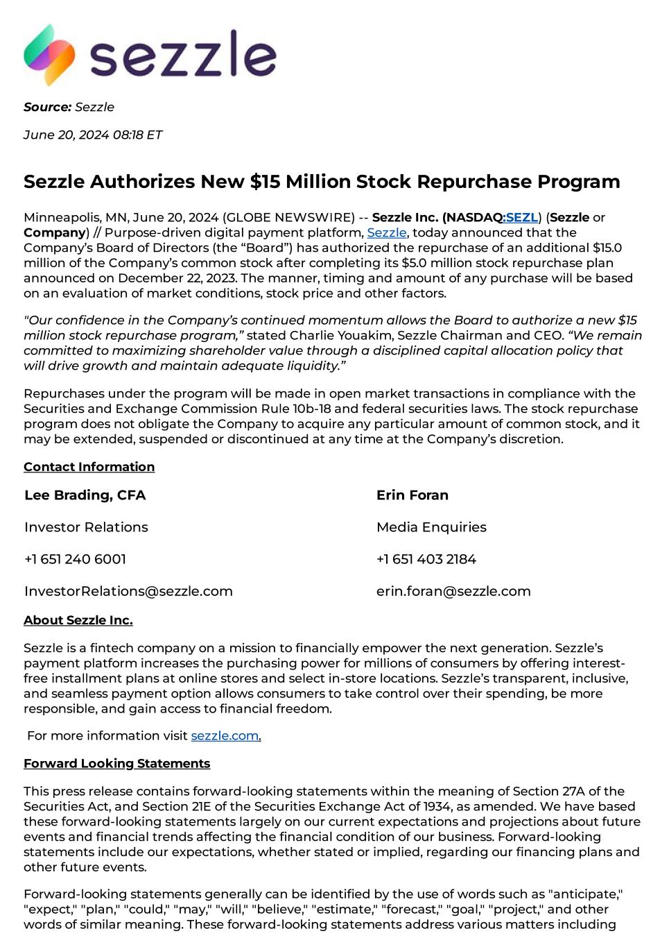 Source: Sezzle June 20, 2024 08:18 ET Sezzle Authorizes New $15 Million Stock Repurchase Program Minneapolis, MN, June 20, 2024 (GLOBE NEWSWIRE) -- Sezzle Inc. (NASDAQ:SEZL) (Sezzle or Company) // Purpose-driven digital payment platform, Sezzle, today announced that the Company’s Board of Directors (the “Board”) has authorized the repurchase of an additional $15.0 million of the Company’s common stock after completing its $5.0 million stock repurchase plan announced on December 22, 2023. The manner, timing and amount of any purchase will be based on an evaluation of market conditions, stock price and other factors. "Our con�dence in the Company’s continued momentum allows the Board to authorize a new $15 million stock repurchase program,” stated Charlie Youakim, Sezzle Chairman and CEO. “We remain committed to maximizing shareholder value through a disciplined capital allocation policy that will drive growth and maintain adequate liquidity.” Repurchases under the program will be made in open market transactions in compliance with the Securities and Exchange Commission Rule 10b-18 and federal securities laws. The stock repurchase program does not obligate the Company to acquire any particular amount of common stock, and it may be extended, suspended or discontinued at any time at the Company’s discretion. Contact Information Lee Brading, CFA Investor Relations +1 651 240 6001 InvestorRelations@sezzle.com Erin Foran Media Enquiries +1 651 403 2184 erin.foran@sezzle.com About Sezzle Inc. Sezzle is a �ntech company on a mission to �nancially empower the next generation. Sezzle’s payment platform increases the purchasing power for millions of consumers by offering interest- free installment plans at online stores and select in-store locations. Sezzle’s transparent, inclusive, and seamless payment option allows consumers to take control over their spending, be more responsible, and gain access to �nancial freedom.  For more information visit sezzle.com. Forward Looking Statements This press release contains forward-looking statements within the meaning of Section 27A of the Securities Act, and Section 21E of the Securities Exchange Act of 1934, as amended. We have based these forward-looking statements largely on our current expectations and projections about future events and �nancial trends affecting the �nancial condition of our business. Forward-looking statements include our expectations, whether stated or implied, regarding our �nancing plans and other future events. Forward-looking statements generally can be identi�ed by the use of words such as "anticipate," "expect," "plan," "could," "may," "will," "believe," "estimate," "forecast," "goal," "project," and other words of similar meaning. These forward-looking statements address various matters including