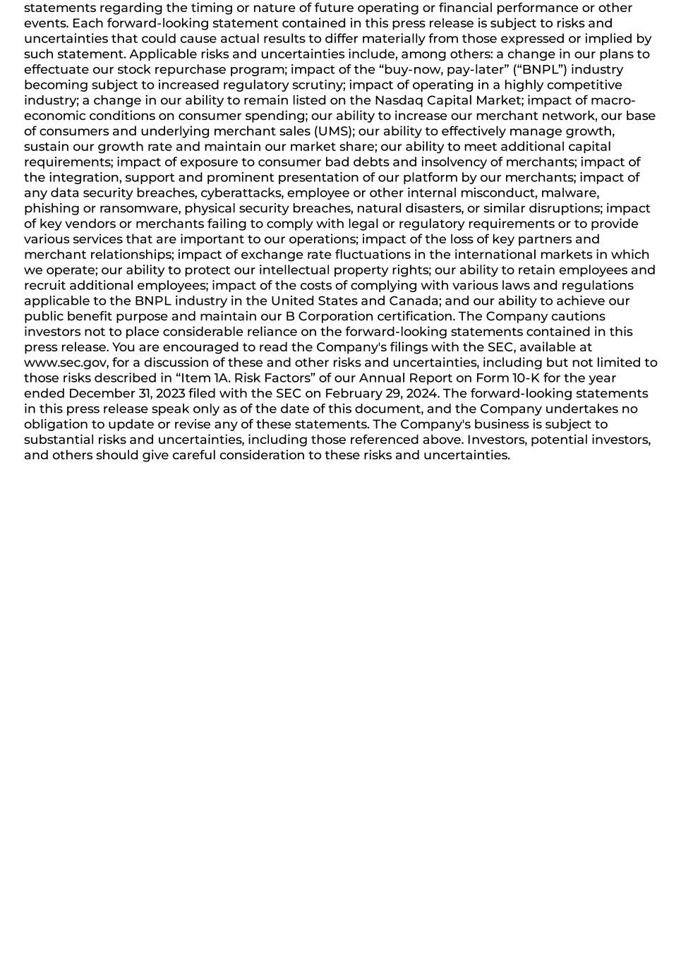 statements regarding the timing or nature of future operating or �nancial performance or other events. Each forward-looking statement contained in this press release is subject to risks and uncertainties that could cause actual results to differ materially from those expressed or implied by such statement. Applicable risks and uncertainties include, among others: a change in our plans to effectuate our stock repurchase program; impact of the “buy-now, pay-later” (“BNPL”) industry becoming subject to increased regulatory scrutiny; impact of operating in a highly competitive industry; a change in our ability to remain listed on the Nasdaq Capital Market; impact of macro- economic conditions on consumer spending; our ability to increase our merchant network, our base of consumers and underlying merchant sales (UMS); our ability to effectively manage growth, sustain our growth rate and maintain our market share; our ability to meet additional capital requirements; impact of exposure to consumer bad debts and insolvency of merchants; impact of the integration, support and prominent presentation of our platform by our merchants; impact of any data security breaches, cyberattacks, employee or other internal misconduct, malware, phishing or ransomware, physical security breaches, natural disasters, or similar disruptions; impact of key vendors or merchants failing to comply with legal or regulatory requirements or to provide various services that are important to our operations; impact of the loss of key partners and merchant relationships; impact of exchange rate �uctuations in the international markets in which we operate; our ability to protect our intellectual property rights; our ability to retain employees and recruit additional employees; impact of the costs of complying with various laws and regulations applicable to the BNPL industry in the United States and Canada; and our ability to achieve our public bene�t purpose and maintain our B Corporation certi�cation. The Company cautions investors not to place considerable reliance on the forward-looking statements contained in this press release. You are encouraged to read the Company's �lings with the SEC, available at www.sec.gov, for a discussion of these and other risks and uncertainties, including but not limited to those risks described in “Item 1A. Risk Factors” of our Annual Report on Form 10-K for the year ended December 31, 2023 �led with the SEC on February 29, 2024. The forward-looking statements in this press release speak only as of the date of this document, and the Company undertakes no obligation to update or revise any of these statements. The Company's business is subject to substantial risks and uncertainties, including those referenced above. Investors, potential investors, and others should give careful consideration to these risks and uncertainties.