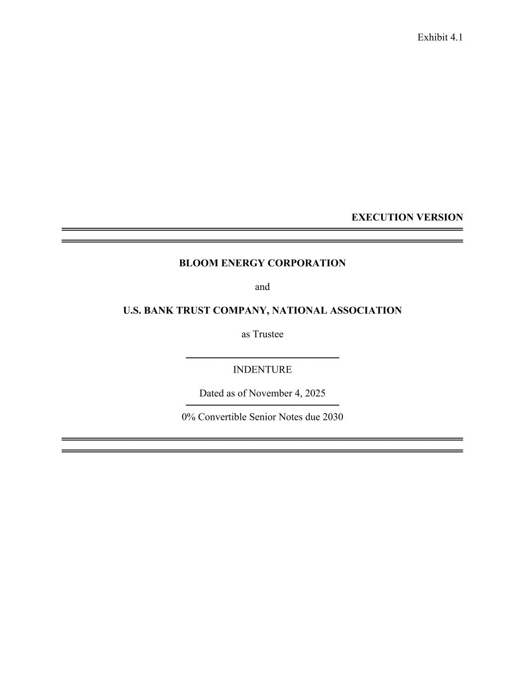 Exhibit 4.1 EXECUTION VERSION ═══════════════════════════════════════════════════════ ═══════════════════════════════════════════════════════ BLOOM ENERGY CORPORATION and U.S. BANK TRUST COMPANY, NATIONAL ASSOCIATION as Trustee ───────────────────── INDENTURE Dated as of November 4, 2025 ───────────────────── 0% Convertible Senior Notes due 2030 ═══════════════════════════════════════════════════════ ═══════════════════════════════════════════════════════