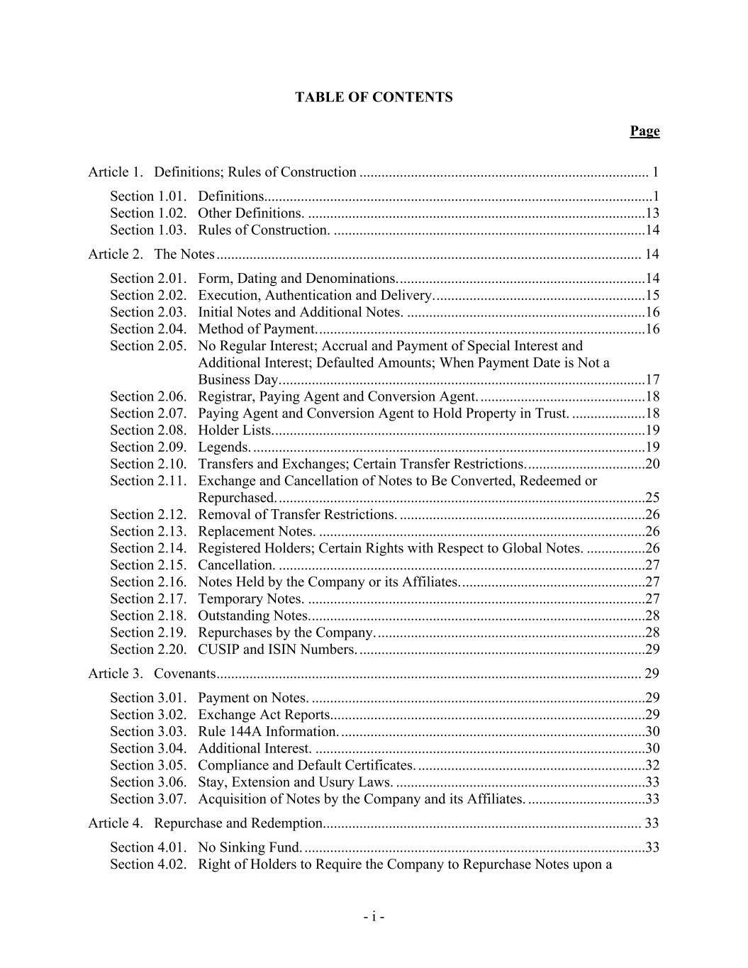 - i - TABLE OF CONTENTS Page Article 1. Definitions; Rules of Construction ............................................................................... 1 Section 1.01. Definitions..........................................................................................................1 Section 1.02. Other Definitions. ............................................................................................13 Section 1.03. Rules of Construction. .....................................................................................14 Article 2. The Notes .................................................................................................................... 14 Section 2.01. Form, Dating and Denominations. ...................................................................14 Section 2.02. Execution, Authentication and Delivery. .........................................................15 Section 2.03. Initial Notes and Additional Notes. .................................................................16 Section 2.04. Method of Payment. .........................................................................................16 Section 2.05. No Regular Interest; Accrual and Payment of Special Interest and Additional Interest; Defaulted Amounts; When Payment Date is Not a Business Day. ...................................................................................................17 Section 2.06. Registrar, Paying Agent and Conversion Agent. .............................................18 Section 2.07. Paying Agent and Conversion Agent to Hold Property in Trust. ....................18 Section 2.08. Holder Lists. .....................................................................................................19 Section 2.09. Legends. ...........................................................................................................19 Section 2.10. Transfers and Exchanges; Certain Transfer Restrictions. ................................20 Section 2.11. Exchange and Cancellation of Notes to Be Converted, Redeemed or Repurchased. ....................................................................................................25 Section 2.12. Removal of Transfer Restrictions. ...................................................................26 Section 2.13. Replacement Notes. .........................................................................................26 Section 2.14. Registered Holders; Certain Rights with Respect to Global Notes. ................26 Section 2.15. Cancellation. ....................................................................................................27 Section 2.16. Notes Held by the Company or its Affiliates. ..................................................27 Section 2.17. Temporary Notes. ............................................................................................27 Section 2.18. Outstanding Notes. ...........................................................................................28 Section 2.19. Repurchases by the Company. .........................................................................28 Section 2.20. CUSIP and ISIN Numbers. ..............................................................................29 Article 3. Covenants .................................................................................................................... 29 Section 3.01. Payment on Notes. ...........................................................................................29 Section 3.02. Exchange Act Reports. .....................................................................................29 Section 3.03. Rule 144A Information. ...................................................................................30 Section 3.04. Additional Interest. ..........................................................................................30 Section 3.05. Compliance and Default Certificates. ..............................................................32 Section 3.06. Stay, Extension and Usury Laws. ....................................................................33 Section 3.07. Acquisition of Notes by the Company and its Affiliates. ................................33 Article 4. Repurchase and Redemption ....................................................................................... 33 Section 4.01. No Sinking Fund. .............................................................................................33 Section 4.02. Right of Holders to Require the Company to Repurchase Notes upon a