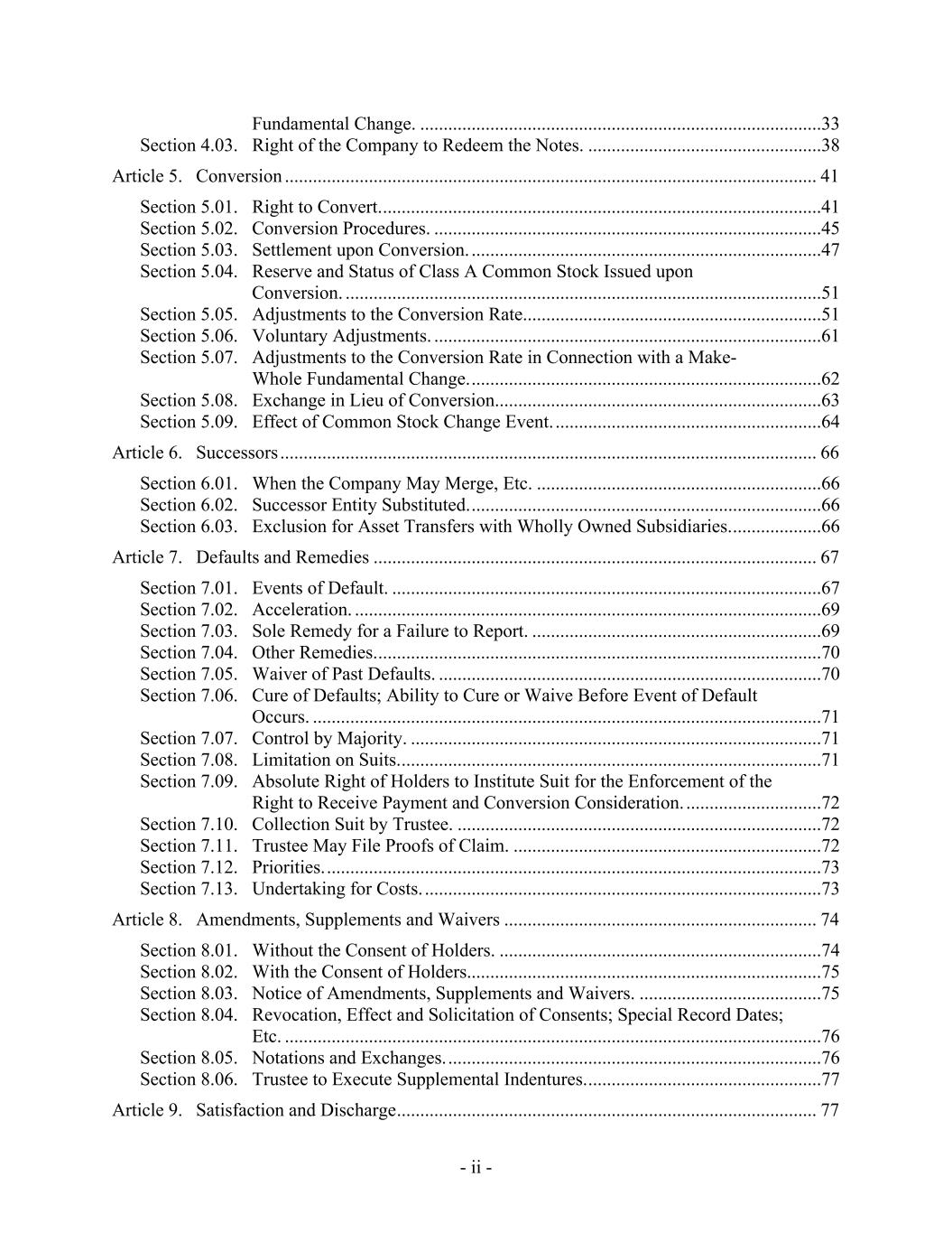 - ii - Fundamental Change. ......................................................................................33 Section 4.03. Right of the Company to Redeem the Notes. ..................................................38 Article 5. Conversion .................................................................................................................. 41 Section 5.01. Right to Convert. ..............................................................................................41 Section 5.02. Conversion Procedures. ...................................................................................45 Section 5.03. Settlement upon Conversion. ...........................................................................47 Section 5.04. Reserve and Status of Class A Common Stock Issued upon Conversion. ......................................................................................................51 Section 5.05. Adjustments to the Conversion Rate. ...............................................................51 Section 5.06. Voluntary Adjustments. ...................................................................................61 Section 5.07. Adjustments to the Conversion Rate in Connection with a Make- Whole Fundamental Change. ...........................................................................62 Section 5.08. Exchange in Lieu of Conversion. .....................................................................63 Section 5.09. Effect of Common Stock Change Event. .........................................................64 Article 6. Successors ................................................................................................................... 66 Section 6.01. When the Company May Merge, Etc. .............................................................66 Section 6.02. Successor Entity Substituted. ...........................................................................66 Section 6.03. Exclusion for Asset Transfers with Wholly Owned Subsidiaries. ...................66 Article 7. Defaults and Remedies ............................................................................................... 67 Section 7.01. Events of Default. ............................................................................................67 Section 7.02. Acceleration. ....................................................................................................69 Section 7.03. Sole Remedy for a Failure to Report. ..............................................................69 Section 7.04. Other Remedies. ...............................................................................................70 Section 7.05. Waiver of Past Defaults. ..................................................................................70 Section 7.06. Cure of Defaults; Ability to Cure or Waive Before Event of Default Occurs. .............................................................................................................71 Section 7.07. Control by Majority. ........................................................................................71 Section 7.08. Limitation on Suits. ..........................................................................................71 Section 7.09. Absolute Right of Holders to Institute Suit for the Enforcement of the Right to Receive Payment and Conversion Consideration. .............................72 Section 7.10. Collection Suit by Trustee. ..............................................................................72 Section 7.11. Trustee May File Proofs of Claim. ..................................................................72 Section 7.12. Priorities. ..........................................................................................................73 Section 7.13. Undertaking for Costs. .....................................................................................73 Article 8. Amendments, Supplements and Waivers ................................................................... 74 Section 8.01. Without the Consent of Holders. .....................................................................74 Section 8.02. With the Consent of Holders............................................................................75 Section 8.03. Notice of Amendments, Supplements and Waivers. .......................................75 Section 8.04. Revocation, Effect and Solicitation of Consents; Special Record Dates; Etc. ...................................................................................................................76 Section 8.05. Notations and Exchanges. ................................................................................76 Section 8.06. Trustee to Execute Supplemental Indentures. ..................................................77 Article 9. Satisfaction and Discharge .......................................................................................... 77