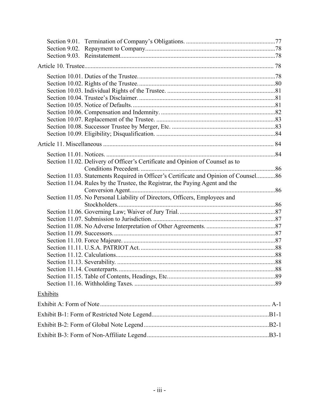 - iii - Section 9.01. Termination of Company’s Obligations. .........................................................77 Section 9.02. Repayment to Company. ..................................................................................78 Section 9.03. Reinstatement. ..................................................................................................78 Article 10. Trustee......................................................................................................................... 78 Section 10.01. Duties of the Trustee. .......................................................................................78 Section 10.02. Rights of the Trustee. .......................................................................................80 Section 10.03. Individual Rights of the Trustee. .....................................................................81 Section 10.04. Trustee’s Disclaimer. .......................................................................................81 Section 10.05. Notice of Defaults. ...........................................................................................81 Section 10.06. Compensation and Indemnity. .........................................................................82 Section 10.07. Replacement of the Trustee. ............................................................................83 Section 10.08. Successor Trustee by Merger, Etc. ..................................................................83 Section 10.09. Eligibility; Disqualification. ............................................................................84 Article 11. Miscellaneous ............................................................................................................. 84 Section 11.01. Notices. ............................................................................................................84 Section 11.02. Delivery of Officer’s Certificate and Opinion of Counsel as to Conditions Precedent. ......................................................................................86 Section 11.03. Statements Required in Officer’s Certificate and Opinion of Counsel. ...........86 Section 11.04. Rules by the Trustee, the Registrar, the Paying Agent and the Conversion Agent.............................................................................................86 Section 11.05. No Personal Liability of Directors, Officers, Employees and Stockholders. ....................................................................................................86 Section 11.06. Governing Law; Waiver of Jury Trial. .............................................................87 Section 11.07. Submission to Jurisdiction. ..............................................................................87 Section 11.08. No Adverse Interpretation of Other Agreements. ............................................87 Section 11.09. Successors. .......................................................................................................87 Section 11.10. Force Majeure. .................................................................................................87 Section 11.11. U.S.A. PATRIOT Act. ......................................................................................88 Section 11.12. Calculations......................................................................................................88 Section 11.13. Severability. .....................................................................................................88 Section 11.14. Counterparts. ....................................................................................................88 Section 11.15. Table of Contents, Headings, Etc. ....................................................................89 Section 11.16. Withholding Taxes. ..........................................................................................89 Exhibits Exhibit A: Form of Note ............................................................................................................. A-1 Exhibit B-1: Form of Restricted Note Legend ...........................................................................B1-1 Exhibit B-2: Form of Global Note Legend ................................................................................B2-1 Exhibit B-3: Form of Non-Affiliate Legend ..............................................................................B3-1