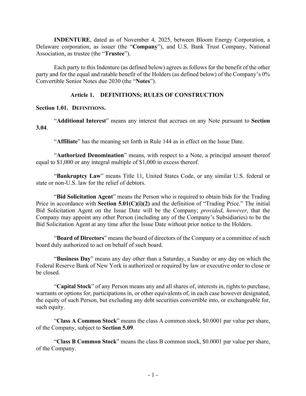 - 1 - INDENTURE, dated as of November 4, 2025, between Bloom Energy Corporation, a Delaware corporation, as issuer (the “Company”), and U.S. Bank Trust Company, National Association, as trustee (the “Trustee”). Each party to this Indenture (as defined below) agrees as follows for the benefit of the other party and for the equal and ratable benefit of the Holders (as defined below) of the Company’s 0% Convertible Senior Notes due 2030 (the “Notes”). Article 1. DEFINITIONS; RULES OF CONSTRUCTION Section 1.01. DEFINITIONS. “Additional Interest” means any interest that accrues on any Note pursuant to Section 3.04. “Affiliate” has the meaning set forth in Rule 144 as in effect on the Issue Date. “Authorized Denomination” means, with respect to a Note, a principal amount thereof equal to $1,000 or any integral multiple of $1,000 in excess thereof. “Bankruptcy Law” means Title 11, United States Code, or any similar U.S. federal or state or non-U.S. law for the relief of debtors. “Bid Solicitation Agent” means the Person who is required to obtain bids for the Trading Price in accordance with Section 5.01(C)(i)(2) and the definition of “Trading Price.” The initial Bid Solicitation Agent on the Issue Date will be the Company; provided, however, that the Company may appoint any other Person (including any of the Company’s Subsidiaries) to be the Bid Solicitation Agent at any time after the Issue Date without prior notice to the Holders. “Board of Directors” means the board of directors of the Company or a committee of such board duly authorized to act on behalf of such board. “Business Day” means any day other than a Saturday, a Sunday or any day on which the Federal Reserve Bank of New York is authorized or required by law or executive order to close or be closed. “Capital Stock” of any Person means any and all shares of, interests in, rights to purchase, warrants or options for, participations in, or other equivalents of, in each case however designated, the equity of such Person, but excluding any debt securities convertible into, or exchangeable for, such equity. “Class A Common Stock” means the class A common stock, $0.0001 par value per share, of the Company, subject to Section 5.09. “Class B Common Stock” means the class B common stock, $0.0001 par value per share, of the Company.