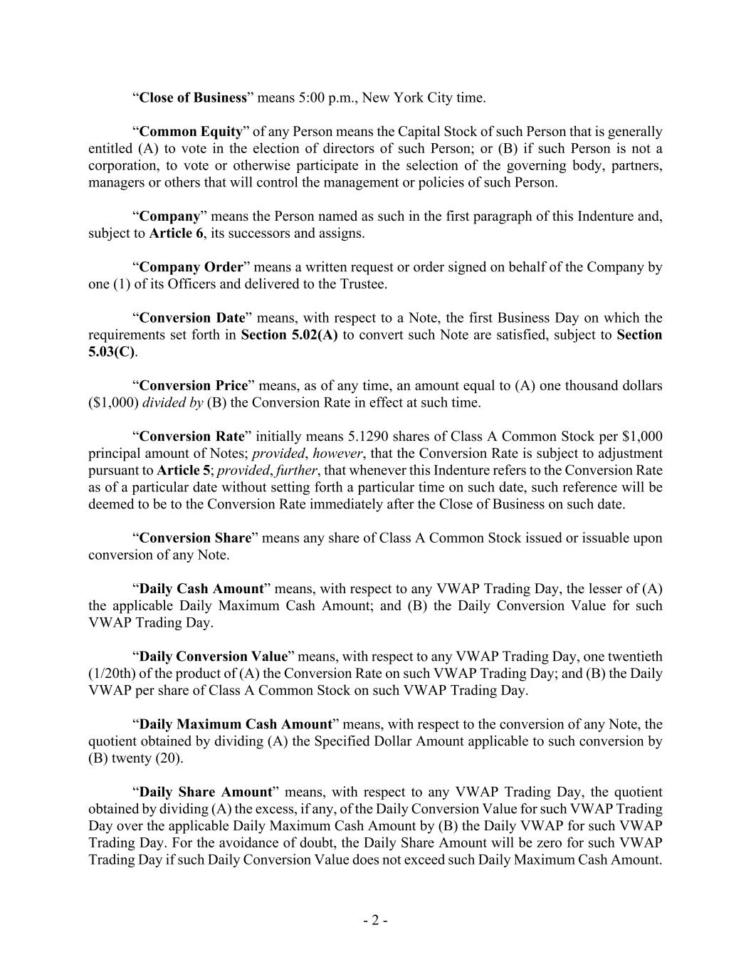 - 2 - “Close of Business” means 5:00 p.m., New York City time. “Common Equity” of any Person means the Capital Stock of such Person that is generally entitled (A) to vote in the election of directors of such Person; or (B) if such Person is not a corporation, to vote or otherwise participate in the selection of the governing body, partners, managers or others that will control the management or policies of such Person. “Company” means the Person named as such in the first paragraph of this Indenture and, subject to Article 6, its successors and assigns. “Company Order” means a written request or order signed on behalf of the Company by one (1) of its Officers and delivered to the Trustee. “Conversion Date” means, with respect to a Note, the first Business Day on which the requirements set forth in Section 5.02(A) to convert such Note are satisfied, subject to Section 5.03(C). “Conversion Price” means, as of any time, an amount equal to (A) one thousand dollars ($1,000) divided by (B) the Conversion Rate in effect at such time. “Conversion Rate” initially means 5.1290 shares of Class A Common Stock per $1,000 principal amount of Notes; provided, however, that the Conversion Rate is subject to adjustment pursuant to Article 5; provided, further, that whenever this Indenture refers to the Conversion Rate as of a particular date without setting forth a particular time on such date, such reference will be deemed to be to the Conversion Rate immediately after the Close of Business on such date. “Conversion Share” means any share of Class A Common Stock issued or issuable upon conversion of any Note. “Daily Cash Amount” means, with respect to any VWAP Trading Day, the lesser of (A) the applicable Daily Maximum Cash Amount; and (B) the Daily Conversion Value for such VWAP Trading Day. “Daily Conversion Value” means, with respect to any VWAP Trading Day, one twentieth (1/20th) of the product of (A) the Conversion Rate on such VWAP Trading Day; and (B) the Daily VWAP per share of Class A Common Stock on such VWAP Trading Day. “Daily Maximum Cash Amount” means, with respect to the conversion of any Note, the quotient obtained by dividing (A) the Specified Dollar Amount applicable to such conversion by (B) twenty (20). “Daily Share Amount” means, with respect to any VWAP Trading Day, the quotient obtained by dividing (A) the excess, if any, of the Daily Conversion Value for such VWAP Trading Day over the applicable Daily Maximum Cash Amount by (B) the Daily VWAP for such VWAP Trading Day. For the avoidance of doubt, the Daily Share Amount will be zero for such VWAP Trading Day if such Daily Conversion Value does not exceed such Daily Maximum Cash Amount.