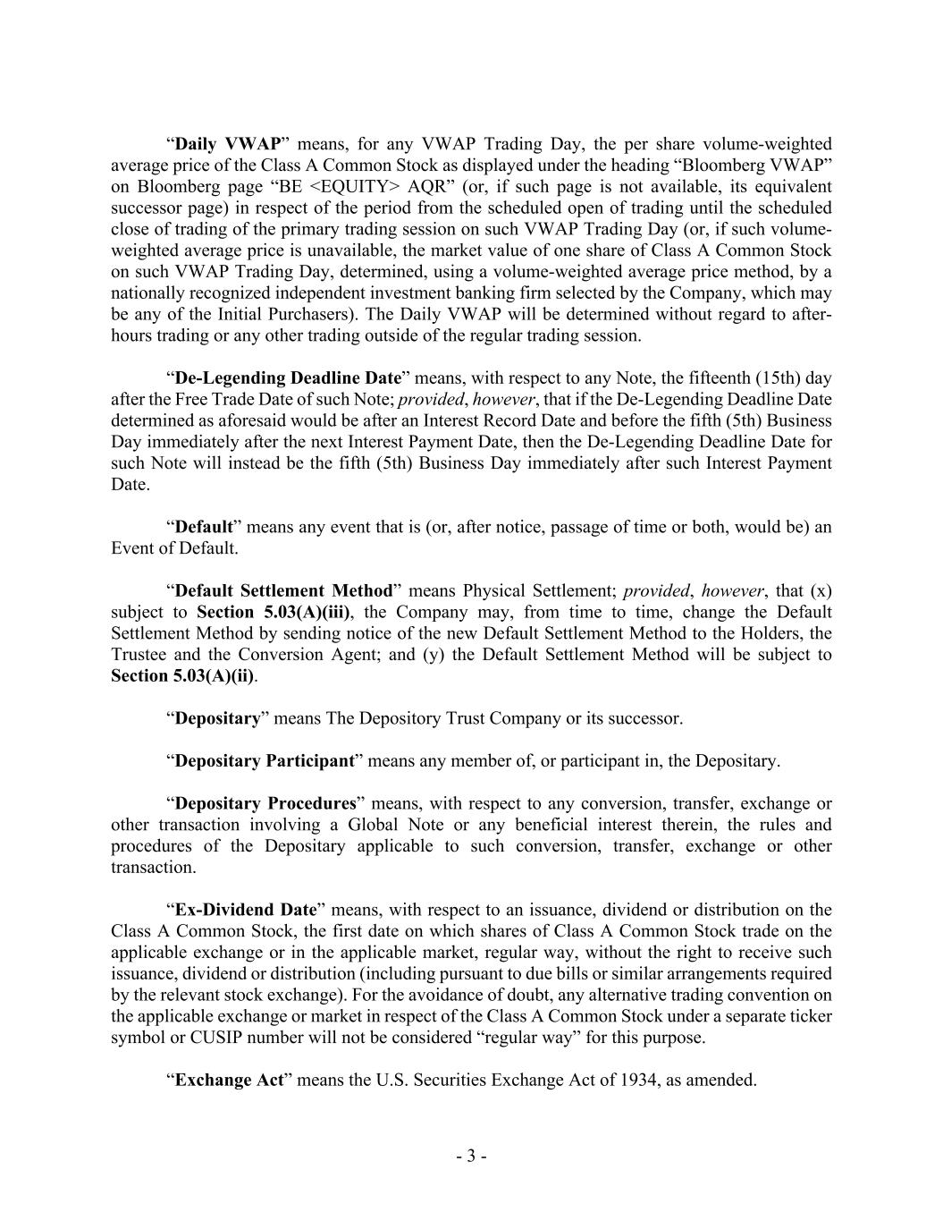 - 3 - “Daily VWAP” means, for any VWAP Trading Day, the per share volume-weighted average price of the Class A Common Stock as displayed under the heading “Bloomberg VWAP” on Bloomberg page “BE <EQUITY> AQR” (or, if such page is not available, its equivalent successor page) in respect of the period from the scheduled open of trading until the scheduled close of trading of the primary trading session on such VWAP Trading Day (or, if such volume- weighted average price is unavailable, the market value of one share of Class A Common Stock on such VWAP Trading Day, determined, using a volume-weighted average price method, by a nationally recognized independent investment banking firm selected by the Company, which may be any of the Initial Purchasers). The Daily VWAP will be determined without regard to after- hours trading or any other trading outside of the regular trading session. “De-Legending Deadline Date” means, with respect to any Note, the fifteenth (15th) day after the Free Trade Date of such Note; provided, however, that if the De-Legending Deadline Date determined as aforesaid would be after an Interest Record Date and before the fifth (5th) Business Day immediately after the next Interest Payment Date, then the De-Legending Deadline Date for such Note will instead be the fifth (5th) Business Day immediately after such Interest Payment Date. “Default” means any event that is (or, after notice, passage of time or both, would be) an Event of Default. “Default Settlement Method” means Physical Settlement; provided, however, that (x) subject to Section 5.03(A)(iii), the Company may, from time to time, change the Default Settlement Method by sending notice of the new Default Settlement Method to the Holders, the Trustee and the Conversion Agent; and (y) the Default Settlement Method will be subject to Section 5.03(A)(ii). “Depositary” means The Depository Trust Company or its successor. “Depositary Participant” means any member of, or participant in, the Depositary. “Depositary Procedures” means, with respect to any conversion, transfer, exchange or other transaction involving a Global Note or any beneficial interest therein, the rules and procedures of the Depositary applicable to such conversion, transfer, exchange or other transaction. “Ex-Dividend Date” means, with respect to an issuance, dividend or distribution on the Class A Common Stock, the first date on which shares of Class A Common Stock trade on the applicable exchange or in the applicable market, regular way, without the right to receive such issuance, dividend or distribution (including pursuant to due bills or similar arrangements required by the relevant stock exchange). For the avoidance of doubt, any alternative trading convention on the applicable exchange or market in respect of the Class A Common Stock under a separate ticker symbol or CUSIP number will not be considered “regular way” for this purpose. “Exchange Act” means the U.S. Securities Exchange Act of 1934, as amended.