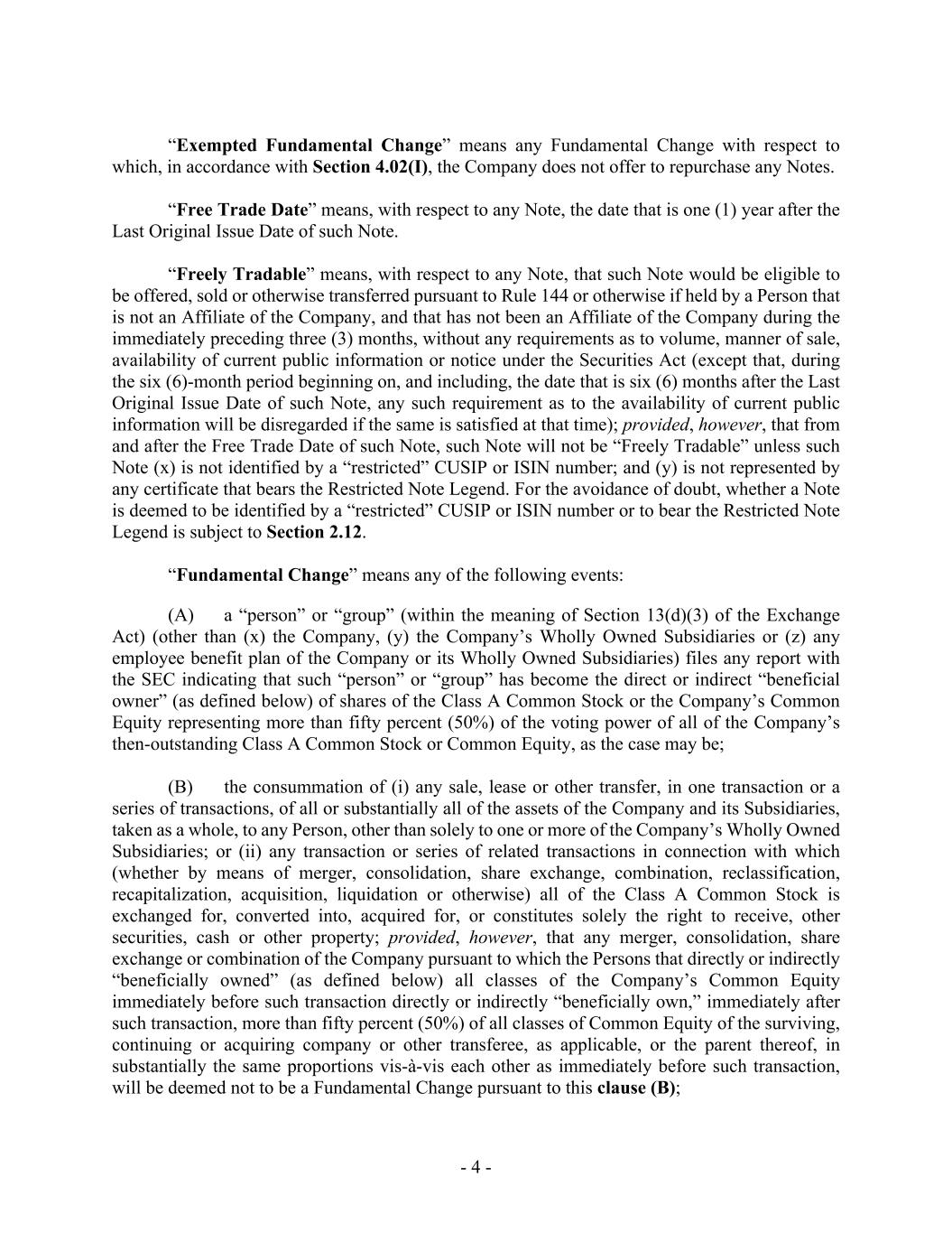 - 4 - “Exempted Fundamental Change” means any Fundamental Change with respect to which, in accordance with Section 4.02(I), the Company does not offer to repurchase any Notes. “Free Trade Date” means, with respect to any Note, the date that is one (1) year after the Last Original Issue Date of such Note. “Freely Tradable” means, with respect to any Note, that such Note would be eligible to be offered, sold or otherwise transferred pursuant to Rule 144 or otherwise if held by a Person that is not an Affiliate of the Company, and that has not been an Affiliate of the Company during the immediately preceding three (3) months, without any requirements as to volume, manner of sale, availability of current public information or notice under the Securities Act (except that, during the six (6)-month period beginning on, and including, the date that is six (6) months after the Last Original Issue Date of such Note, any such requirement as to the availability of current public information will be disregarded if the same is satisfied at that time); provided, however, that from and after the Free Trade Date of such Note, such Note will not be “Freely Tradable” unless such Note (x) is not identified by a “restricted” CUSIP or ISIN number; and (y) is not represented by any certificate that bears the Restricted Note Legend. For the avoidance of doubt, whether a Note is deemed to be identified by a “restricted” CUSIP or ISIN number or to bear the Restricted Note Legend is subject to Section 2.12. “Fundamental Change” means any of the following events: (A) a “person” or “group” (within the meaning of Section 13(d)(3) of the Exchange Act) (other than (x) the Company, (y) the Company’s Wholly Owned Subsidiaries or (z) any employee benefit plan of the Company or its Wholly Owned Subsidiaries) files any report with the SEC indicating that such “person” or “group” has become the direct or indirect “beneficial owner” (as defined below) of shares of the Class A Common Stock or the Company’s Common Equity representing more than fifty percent (50%) of the voting power of all of the Company’s then-outstanding Class A Common Stock or Common Equity, as the case may be; (B) the consummation of (i) any sale, lease or other transfer, in one transaction or a series of transactions, of all or substantially all of the assets of the Company and its Subsidiaries, taken as a whole, to any Person, other than solely to one or more of the Company’s Wholly Owned Subsidiaries; or (ii) any transaction or series of related transactions in connection with which (whether by means of merger, consolidation, share exchange, combination, reclassification, recapitalization, acquisition, liquidation or otherwise) all of the Class A Common Stock is exchanged for, converted into, acquired for, or constitutes solely the right to receive, other securities, cash or other property; provided, however, that any merger, consolidation, share exchange or combination of the Company pursuant to which the Persons that directly or indirectly “beneficially owned” (as defined below) all classes of the Company’s Common Equity immediately before such transaction directly or indirectly “beneficially own,” immediately after such transaction, more than fifty percent (50%) of all classes of Common Equity of the surviving, continuing or acquiring company or other transferee, as applicable, or the parent thereof, in substantially the same proportions vis-à-vis each other as immediately before such transaction, will be deemed not to be a Fundamental Change pursuant to this clause (B);