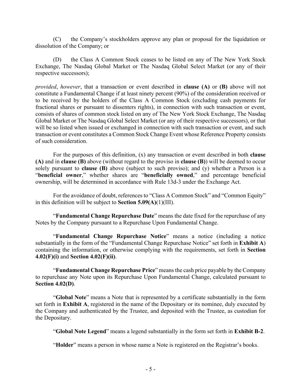 - 5 - (C) the Company’s stockholders approve any plan or proposal for the liquidation or dissolution of the Company; or (D) the Class A Common Stock ceases to be listed on any of The New York Stock Exchange, The Nasdaq Global Market or The Nasdaq Global Select Market (or any of their respective successors); provided, however, that a transaction or event described in clause (A) or (B) above will not constitute a Fundamental Change if at least ninety percent (90%) of the consideration received or to be received by the holders of the Class A Common Stock (excluding cash payments for fractional shares or pursuant to dissenters rights), in connection with such transaction or event, consists of shares of common stock listed on any of The New York Stock Exchange, The Nasdaq Global Market or The Nasdaq Global Select Market (or any of their respective successors), or that will be so listed when issued or exchanged in connection with such transaction or event, and such transaction or event constitutes a Common Stock Change Event whose Reference Property consists of such consideration. For the purposes of this definition, (x) any transaction or event described in both clause (A) and in clause (B) above (without regard to the proviso in clause (B)) will be deemed to occur solely pursuant to clause (B) above (subject to such proviso); and (y) whether a Person is a “beneficial owner,” whether shares are “beneficially owned,” and percentage beneficial ownership, will be determined in accordance with Rule 13d-3 under the Exchange Act. For the avoidance of doubt, references to “Class A Common Stock” and “Common Equity” in this definition will be subject to Section 5.09(A)(1)(III). “Fundamental Change Repurchase Date” means the date fixed for the repurchase of any Notes by the Company pursuant to a Repurchase Upon Fundamental Change. “Fundamental Change Repurchase Notice” means a notice (including a notice substantially in the form of the “Fundamental Change Repurchase Notice” set forth in Exhibit A) containing the information, or otherwise complying with the requirements, set forth in Section 4.02(F)(i) and Section 4.02(F)(ii). “Fundamental Change Repurchase Price” means the cash price payable by the Company to repurchase any Note upon its Repurchase Upon Fundamental Change, calculated pursuant to Section 4.02(D). “Global Note” means a Note that is represented by a certificate substantially in the form set forth in Exhibit A, registered in the name of the Depositary or its nominee, duly executed by the Company and authenticated by the Trustee, and deposited with the Trustee, as custodian for the Depositary. “Global Note Legend” means a legend substantially in the form set forth in Exhibit B-2. “Holder” means a person in whose name a Note is registered on the Registrar’s books.