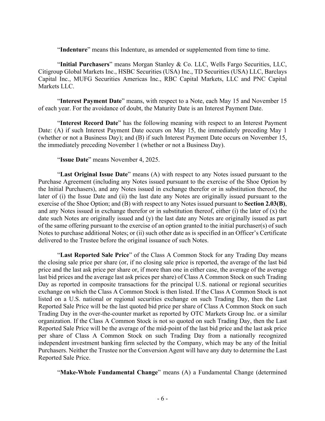 - 6 - “Indenture” means this Indenture, as amended or supplemented from time to time. “Initial Purchasers” means Morgan Stanley & Co. LLC, Wells Fargo Securities, LLC, Citigroup Global Markets Inc., HSBC Securities (USA) Inc., TD Securities (USA) LLC, Barclays Capital Inc., MUFG Securities Americas Inc., RBC Capital Markets, LLC and PNC Capital Markets LLC. “Interest Payment Date” means, with respect to a Note, each May 15 and November 15 of each year. For the avoidance of doubt, the Maturity Date is an Interest Payment Date. “Interest Record Date” has the following meaning with respect to an Interest Payment Date: (A) if such Interest Payment Date occurs on May 15, the immediately preceding May 1 (whether or not a Business Day); and (B) if such Interest Payment Date occurs on November 15, the immediately preceding November 1 (whether or not a Business Day). “Issue Date” means November 4, 2025. “Last Original Issue Date” means (A) with respect to any Notes issued pursuant to the Purchase Agreement (including any Notes issued pursuant to the exercise of the Shoe Option by the Initial Purchasers), and any Notes issued in exchange therefor or in substitution thereof, the later of (i) the Issue Date and (ii) the last date any Notes are originally issued pursuant to the exercise of the Shoe Option; and (B) with respect to any Notes issued pursuant to Section 2.03(B), and any Notes issued in exchange therefor or in substitution thereof, either (i) the later of (x) the date such Notes are originally issued and (y) the last date any Notes are originally issued as part of the same offering pursuant to the exercise of an option granted to the initial purchaser(s) of such Notes to purchase additional Notes; or (ii) such other date as is specified in an Officer’s Certificate delivered to the Trustee before the original issuance of such Notes. “Last Reported Sale Price” of the Class A Common Stock for any Trading Day means the closing sale price per share (or, if no closing sale price is reported, the average of the last bid price and the last ask price per share or, if more than one in either case, the average of the average last bid prices and the average last ask prices per share) of Class A Common Stock on such Trading Day as reported in composite transactions for the principal U.S. national or regional securities exchange on which the Class A Common Stock is then listed. If the Class A Common Stock is not listed on a U.S. national or regional securities exchange on such Trading Day, then the Last Reported Sale Price will be the last quoted bid price per share of Class A Common Stock on such Trading Day in the over-the-counter market as reported by OTC Markets Group Inc. or a similar organization. If the Class A Common Stock is not so quoted on such Trading Day, then the Last Reported Sale Price will be the average of the mid-point of the last bid price and the last ask price per share of Class A Common Stock on such Trading Day from a nationally recognized independent investment banking firm selected by the Company, which may be any of the Initial Purchasers. Neither the Trustee nor the Conversion Agent will have any duty to determine the Last Reported Sale Price. “Make-Whole Fundamental Change” means (A) a Fundamental Change (determined