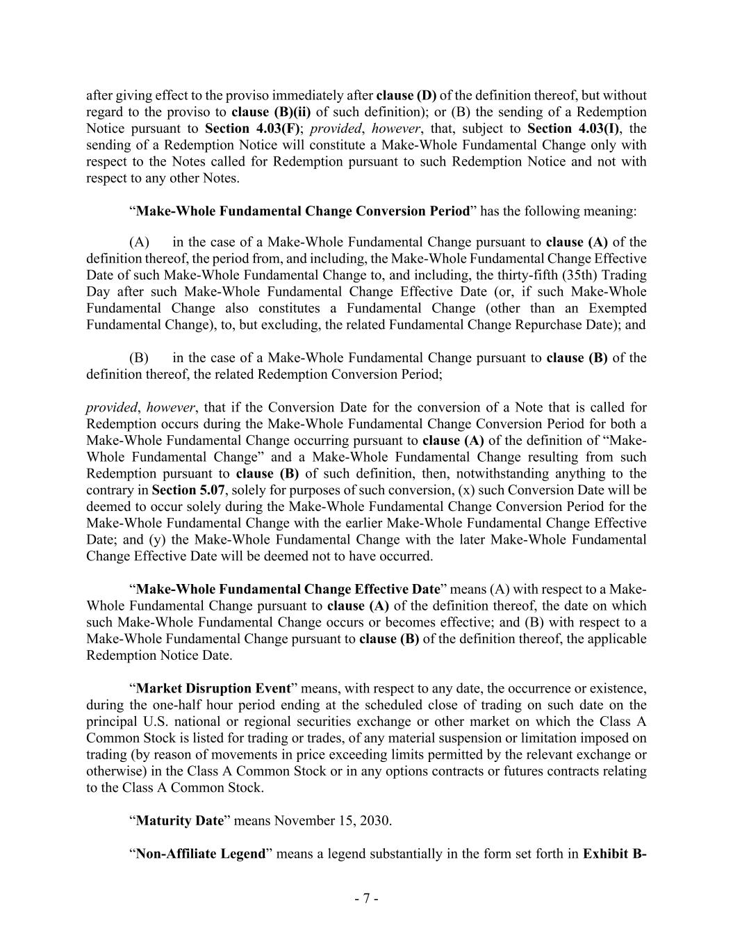 - 7 - after giving effect to the proviso immediately after clause (D) of the definition thereof, but without regard to the proviso to clause (B)(ii) of such definition); or (B) the sending of a Redemption Notice pursuant to Section 4.03(F); provided, however, that, subject to Section 4.03(I), the sending of a Redemption Notice will constitute a Make-Whole Fundamental Change only with respect to the Notes called for Redemption pursuant to such Redemption Notice and not with respect to any other Notes. “Make-Whole Fundamental Change Conversion Period” has the following meaning: (A) in the case of a Make-Whole Fundamental Change pursuant to clause (A) of the definition thereof, the period from, and including, the Make-Whole Fundamental Change Effective Date of such Make-Whole Fundamental Change to, and including, the thirty-fifth (35th) Trading Day after such Make-Whole Fundamental Change Effective Date (or, if such Make-Whole Fundamental Change also constitutes a Fundamental Change (other than an Exempted Fundamental Change), to, but excluding, the related Fundamental Change Repurchase Date); and (B) in the case of a Make-Whole Fundamental Change pursuant to clause (B) of the definition thereof, the related Redemption Conversion Period; provided, however, that if the Conversion Date for the conversion of a Note that is called for Redemption occurs during the Make-Whole Fundamental Change Conversion Period for both a Make-Whole Fundamental Change occurring pursuant to clause (A) of the definition of “Make- Whole Fundamental Change” and a Make-Whole Fundamental Change resulting from such Redemption pursuant to clause (B) of such definition, then, notwithstanding anything to the contrary in Section 5.07, solely for purposes of such conversion, (x) such Conversion Date will be deemed to occur solely during the Make-Whole Fundamental Change Conversion Period for the Make-Whole Fundamental Change with the earlier Make-Whole Fundamental Change Effective Date; and (y) the Make-Whole Fundamental Change with the later Make-Whole Fundamental Change Effective Date will be deemed not to have occurred. “Make-Whole Fundamental Change Effective Date” means (A) with respect to a Make- Whole Fundamental Change pursuant to clause (A) of the definition thereof, the date on which such Make-Whole Fundamental Change occurs or becomes effective; and (B) with respect to a Make-Whole Fundamental Change pursuant to clause (B) of the definition thereof, the applicable Redemption Notice Date. “Market Disruption Event” means, with respect to any date, the occurrence or existence, during the one-half hour period ending at the scheduled close of trading on such date on the principal U.S. national or regional securities exchange or other market on which the Class A Common Stock is listed for trading or trades, of any material suspension or limitation imposed on trading (by reason of movements in price exceeding limits permitted by the relevant exchange or otherwise) in the Class A Common Stock or in any options contracts or futures contracts relating to the Class A Common Stock. “Maturity Date” means November 15, 2030. “Non-Affiliate Legend” means a legend substantially in the form set forth in Exhibit B-