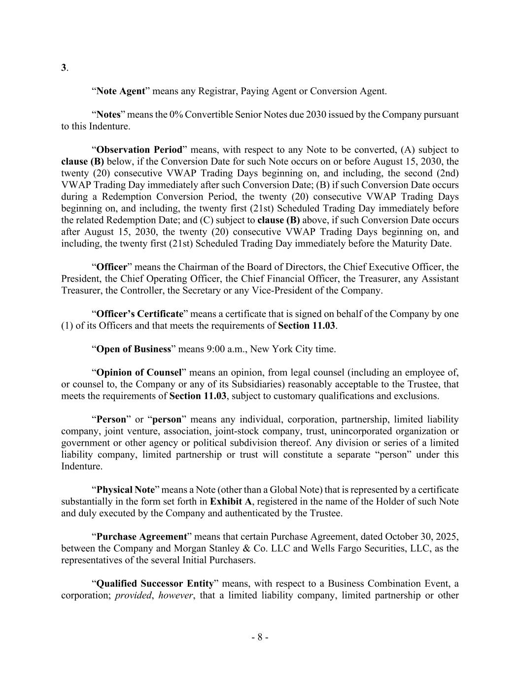 - 8 - 3. “Note Agent” means any Registrar, Paying Agent or Conversion Agent. “Notes” means the 0% Convertible Senior Notes due 2030 issued by the Company pursuant to this Indenture. “Observation Period” means, with respect to any Note to be converted, (A) subject to clause (B) below, if the Conversion Date for such Note occurs on or before August 15, 2030, the twenty (20) consecutive VWAP Trading Days beginning on, and including, the second (2nd) VWAP Trading Day immediately after such Conversion Date; (B) if such Conversion Date occurs during a Redemption Conversion Period, the twenty (20) consecutive VWAP Trading Days beginning on, and including, the twenty first (21st) Scheduled Trading Day immediately before the related Redemption Date; and (C) subject to clause (B) above, if such Conversion Date occurs after August 15, 2030, the twenty (20) consecutive VWAP Trading Days beginning on, and including, the twenty first (21st) Scheduled Trading Day immediately before the Maturity Date. “Officer” means the Chairman of the Board of Directors, the Chief Executive Officer, the President, the Chief Operating Officer, the Chief Financial Officer, the Treasurer, any Assistant Treasurer, the Controller, the Secretary or any Vice-President of the Company. “Officer’s Certificate” means a certificate that is signed on behalf of the Company by one (1) of its Officers and that meets the requirements of Section 11.03. “Open of Business” means 9:00 a.m., New York City time. “Opinion of Counsel” means an opinion, from legal counsel (including an employee of, or counsel to, the Company or any of its Subsidiaries) reasonably acceptable to the Trustee, that meets the requirements of Section 11.03, subject to customary qualifications and exclusions. “Person” or “person” means any individual, corporation, partnership, limited liability company, joint venture, association, joint-stock company, trust, unincorporated organization or government or other agency or political subdivision thereof. Any division or series of a limited liability company, limited partnership or trust will constitute a separate “person” under this Indenture. “Physical Note” means a Note (other than a Global Note) that is represented by a certificate substantially in the form set forth in Exhibit A, registered in the name of the Holder of such Note and duly executed by the Company and authenticated by the Trustee. “Purchase Agreement” means that certain Purchase Agreement, dated October 30, 2025, between the Company and Morgan Stanley & Co. LLC and Wells Fargo Securities, LLC, as the representatives of the several Initial Purchasers. “Qualified Successor Entity” means, with respect to a Business Combination Event, a corporation; provided, however, that a limited liability company, limited partnership or other