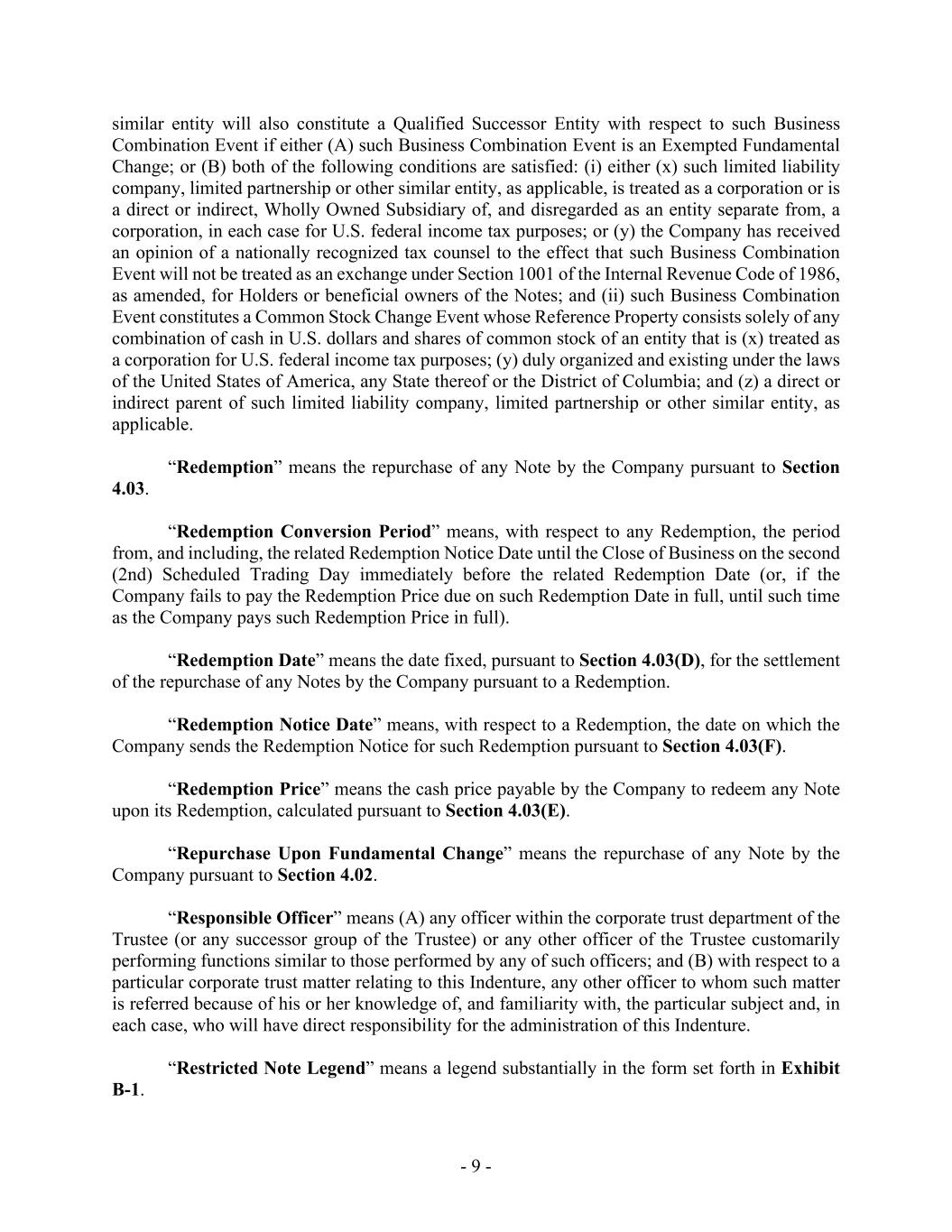 - 9 - similar entity will also constitute a Qualified Successor Entity with respect to such Business Combination Event if either (A) such Business Combination Event is an Exempted Fundamental Change; or (B) both of the following conditions are satisfied: (i) either (x) such limited liability company, limited partnership or other similar entity, as applicable, is treated as a corporation or is a direct or indirect, Wholly Owned Subsidiary of, and disregarded as an entity separate from, a corporation, in each case for U.S. federal income tax purposes; or (y) the Company has received an opinion of a nationally recognized tax counsel to the effect that such Business Combination Event will not be treated as an exchange under Section 1001 of the Internal Revenue Code of 1986, as amended, for Holders or beneficial owners of the Notes; and (ii) such Business Combination Event constitutes a Common Stock Change Event whose Reference Property consists solely of any combination of cash in U.S. dollars and shares of common stock of an entity that is (x) treated as a corporation for U.S. federal income tax purposes; (y) duly organized and existing under the laws of the United States of America, any State thereof or the District of Columbia; and (z) a direct or indirect parent of such limited liability company, limited partnership or other similar entity, as applicable. “Redemption” means the repurchase of any Note by the Company pursuant to Section 4.03. “Redemption Conversion Period” means, with respect to any Redemption, the period from, and including, the related Redemption Notice Date until the Close of Business on the second (2nd) Scheduled Trading Day immediately before the related Redemption Date (or, if the Company fails to pay the Redemption Price due on such Redemption Date in full, until such time as the Company pays such Redemption Price in full). “Redemption Date” means the date fixed, pursuant to Section 4.03(D), for the settlement of the repurchase of any Notes by the Company pursuant to a Redemption. “Redemption Notice Date” means, with respect to a Redemption, the date on which the Company sends the Redemption Notice for such Redemption pursuant to Section 4.03(F). “Redemption Price” means the cash price payable by the Company to redeem any Note upon its Redemption, calculated pursuant to Section 4.03(E). “Repurchase Upon Fundamental Change” means the repurchase of any Note by the Company pursuant to Section 4.02. “Responsible Officer” means (A) any officer within the corporate trust department of the Trustee (or any successor group of the Trustee) or any other officer of the Trustee customarily performing functions similar to those performed by any of such officers; and (B) with respect to a particular corporate trust matter relating to this Indenture, any other officer to whom such matter is referred because of his or her knowledge of, and familiarity with, the particular subject and, in each case, who will have direct responsibility for the administration of this Indenture. “Restricted Note Legend” means a legend substantially in the form set forth in Exhibit B-1.