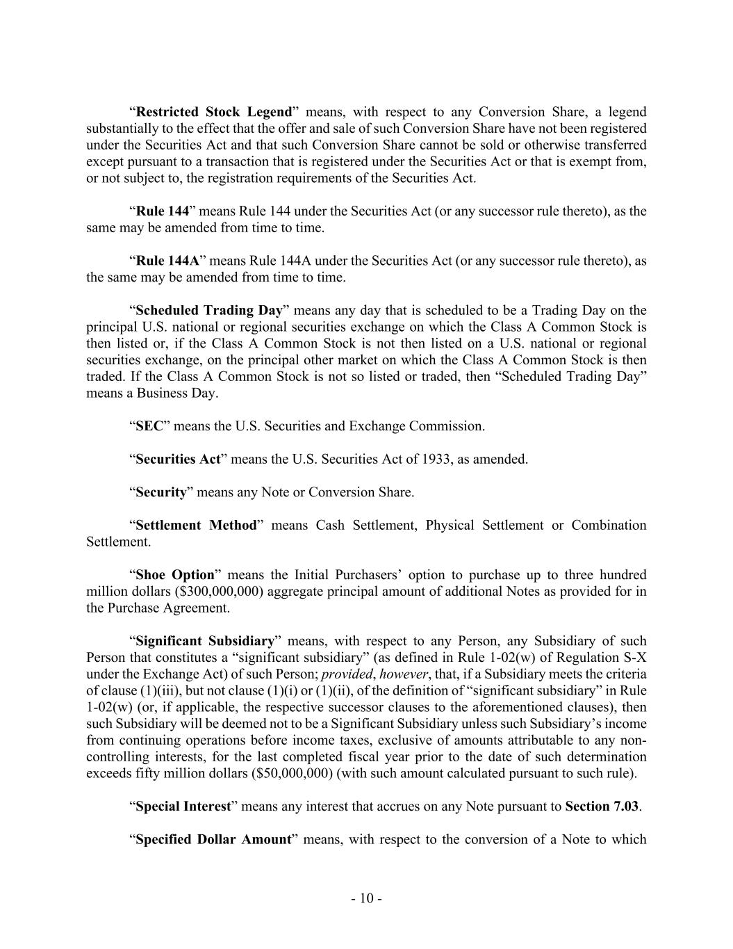 - 10 - “Restricted Stock Legend” means, with respect to any Conversion Share, a legend substantially to the effect that the offer and sale of such Conversion Share have not been registered under the Securities Act and that such Conversion Share cannot be sold or otherwise transferred except pursuant to a transaction that is registered under the Securities Act or that is exempt from, or not subject to, the registration requirements of the Securities Act. “Rule 144” means Rule 144 under the Securities Act (or any successor rule thereto), as the same may be amended from time to time. “Rule 144A” means Rule 144A under the Securities Act (or any successor rule thereto), as the same may be amended from time to time. “Scheduled Trading Day” means any day that is scheduled to be a Trading Day on the principal U.S. national or regional securities exchange on which the Class A Common Stock is then listed or, if the Class A Common Stock is not then listed on a U.S. national or regional securities exchange, on the principal other market on which the Class A Common Stock is then traded. If the Class A Common Stock is not so listed or traded, then “Scheduled Trading Day” means a Business Day. “SEC” means the U.S. Securities and Exchange Commission. “Securities Act” means the U.S. Securities Act of 1933, as amended. “Security” means any Note or Conversion Share. “Settlement Method” means Cash Settlement, Physical Settlement or Combination Settlement. “Shoe Option” means the Initial Purchasers’ option to purchase up to three hundred million dollars ($300,000,000) aggregate principal amount of additional Notes as provided for in the Purchase Agreement. “Significant Subsidiary” means, with respect to any Person, any Subsidiary of such Person that constitutes a “significant subsidiary” (as defined in Rule 1-02(w) of Regulation S-X under the Exchange Act) of such Person; provided, however, that, if a Subsidiary meets the criteria of clause (1)(iii), but not clause (1)(i) or (1)(ii), of the definition of “significant subsidiary” in Rule 1-02(w) (or, if applicable, the respective successor clauses to the aforementioned clauses), then such Subsidiary will be deemed not to be a Significant Subsidiary unless such Subsidiary’s income from continuing operations before income taxes, exclusive of amounts attributable to any non- controlling interests, for the last completed fiscal year prior to the date of such determination exceeds fifty million dollars ($50,000,000) (with such amount calculated pursuant to such rule). “Special Interest” means any interest that accrues on any Note pursuant to Section 7.03. “Specified Dollar Amount” means, with respect to the conversion of a Note to which
