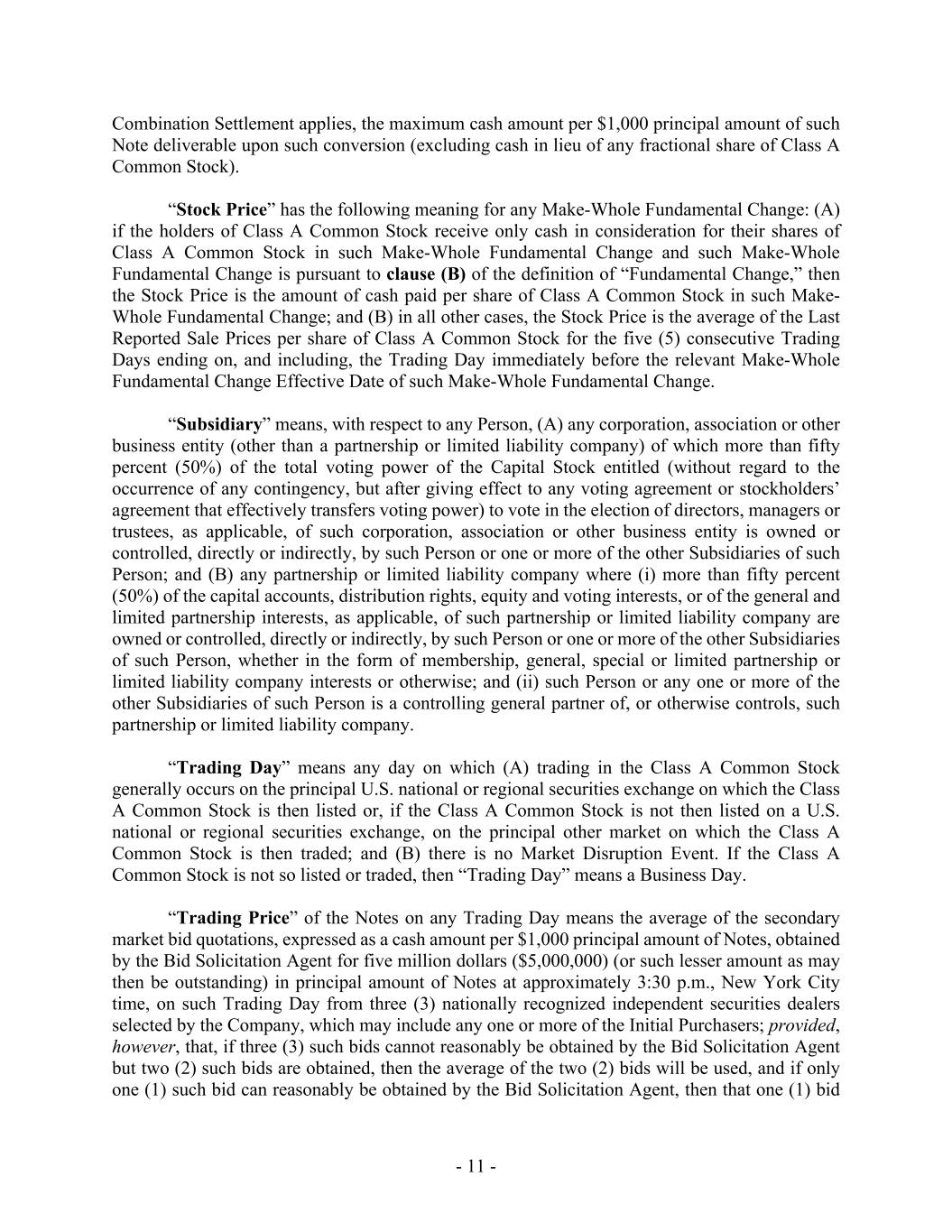 - 11 - Combination Settlement applies, the maximum cash amount per $1,000 principal amount of such Note deliverable upon such conversion (excluding cash in lieu of any fractional share of Class A Common Stock). “Stock Price” has the following meaning for any Make-Whole Fundamental Change: (A) if the holders of Class A Common Stock receive only cash in consideration for their shares of Class A Common Stock in such Make-Whole Fundamental Change and such Make-Whole Fundamental Change is pursuant to clause (B) of the definition of “Fundamental Change,” then the Stock Price is the amount of cash paid per share of Class A Common Stock in such Make- Whole Fundamental Change; and (B) in all other cases, the Stock Price is the average of the Last Reported Sale Prices per share of Class A Common Stock for the five (5) consecutive Trading Days ending on, and including, the Trading Day immediately before the relevant Make-Whole Fundamental Change Effective Date of such Make-Whole Fundamental Change. “Subsidiary” means, with respect to any Person, (A) any corporation, association or other business entity (other than a partnership or limited liability company) of which more than fifty percent (50%) of the total voting power of the Capital Stock entitled (without regard to the occurrence of any contingency, but after giving effect to any voting agreement or stockholders’ agreement that effectively transfers voting power) to vote in the election of directors, managers or trustees, as applicable, of such corporation, association or other business entity is owned or controlled, directly or indirectly, by such Person or one or more of the other Subsidiaries of such Person; and (B) any partnership or limited liability company where (i) more than fifty percent (50%) of the capital accounts, distribution rights, equity and voting interests, or of the general and limited partnership interests, as applicable, of such partnership or limited liability company are owned or controlled, directly or indirectly, by such Person or one or more of the other Subsidiaries of such Person, whether in the form of membership, general, special or limited partnership or limited liability company interests or otherwise; and (ii) such Person or any one or more of the other Subsidiaries of such Person is a controlling general partner of, or otherwise controls, such partnership or limited liability company. “Trading Day” means any day on which (A) trading in the Class A Common Stock generally occurs on the principal U.S. national or regional securities exchange on which the Class A Common Stock is then listed or, if the Class A Common Stock is not then listed on a U.S. national or regional securities exchange, on the principal other market on which the Class A Common Stock is then traded; and (B) there is no Market Disruption Event. If the Class A Common Stock is not so listed or traded, then “Trading Day” means a Business Day. “Trading Price” of the Notes on any Trading Day means the average of the secondary market bid quotations, expressed as a cash amount per $1,000 principal amount of Notes, obtained by the Bid Solicitation Agent for five million dollars ($5,000,000) (or such lesser amount as may then be outstanding) in principal amount of Notes at approximately 3:30 p.m., New York City time, on such Trading Day from three (3) nationally recognized independent securities dealers selected by the Company, which may include any one or more of the Initial Purchasers; provided, however, that, if three (3) such bids cannot reasonably be obtained by the Bid Solicitation Agent but two (2) such bids are obtained, then the average of the two (2) bids will be used, and if only one (1) such bid can reasonably be obtained by the Bid Solicitation Agent, then that one (1) bid