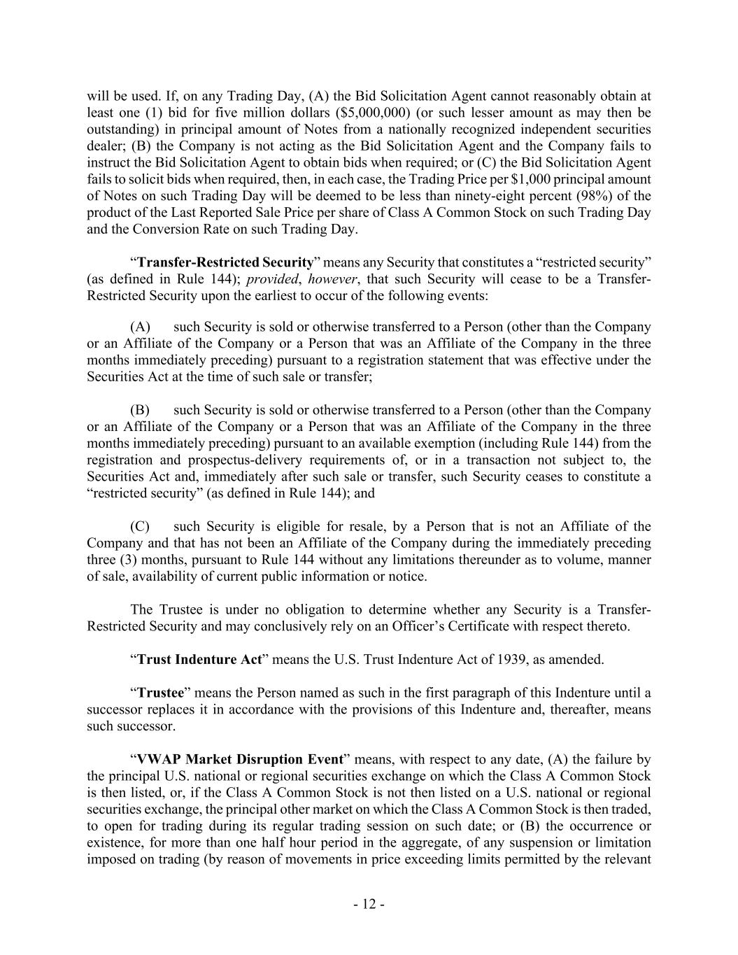 - 12 - will be used. If, on any Trading Day, (A) the Bid Solicitation Agent cannot reasonably obtain at least one (1) bid for five million dollars ($5,000,000) (or such lesser amount as may then be outstanding) in principal amount of Notes from a nationally recognized independent securities dealer; (B) the Company is not acting as the Bid Solicitation Agent and the Company fails to instruct the Bid Solicitation Agent to obtain bids when required; or (C) the Bid Solicitation Agent fails to solicit bids when required, then, in each case, the Trading Price per $1,000 principal amount of Notes on such Trading Day will be deemed to be less than ninety-eight percent (98%) of the product of the Last Reported Sale Price per share of Class A Common Stock on such Trading Day and the Conversion Rate on such Trading Day. “Transfer-Restricted Security” means any Security that constitutes a “restricted security” (as defined in Rule 144); provided, however, that such Security will cease to be a Transfer- Restricted Security upon the earliest to occur of the following events: (A) such Security is sold or otherwise transferred to a Person (other than the Company or an Affiliate of the Company or a Person that was an Affiliate of the Company in the three months immediately preceding) pursuant to a registration statement that was effective under the Securities Act at the time of such sale or transfer; (B) such Security is sold or otherwise transferred to a Person (other than the Company or an Affiliate of the Company or a Person that was an Affiliate of the Company in the three months immediately preceding) pursuant to an available exemption (including Rule 144) from the registration and prospectus-delivery requirements of, or in a transaction not subject to, the Securities Act and, immediately after such sale or transfer, such Security ceases to constitute a “restricted security” (as defined in Rule 144); and (C) such Security is eligible for resale, by a Person that is not an Affiliate of the Company and that has not been an Affiliate of the Company during the immediately preceding three (3) months, pursuant to Rule 144 without any limitations thereunder as to volume, manner of sale, availability of current public information or notice. The Trustee is under no obligation to determine whether any Security is a Transfer- Restricted Security and may conclusively rely on an Officer’s Certificate with respect thereto. “Trust Indenture Act” means the U.S. Trust Indenture Act of 1939, as amended. “Trustee” means the Person named as such in the first paragraph of this Indenture until a successor replaces it in accordance with the provisions of this Indenture and, thereafter, means such successor. “VWAP Market Disruption Event” means, with respect to any date, (A) the failure by the principal U.S. national or regional securities exchange on which the Class A Common Stock is then listed, or, if the Class A Common Stock is not then listed on a U.S. national or regional securities exchange, the principal other market on which the Class A Common Stock is then traded, to open for trading during its regular trading session on such date; or (B) the occurrence or existence, for more than one half hour period in the aggregate, of any suspension or limitation imposed on trading (by reason of movements in price exceeding limits permitted by the relevant
