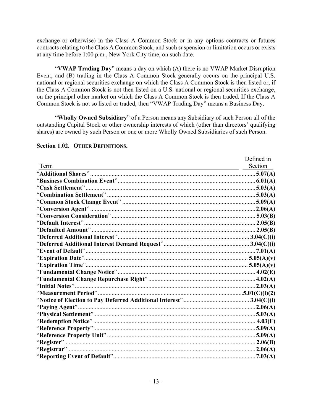 - 13 - exchange or otherwise) in the Class A Common Stock or in any options contracts or futures contracts relating to the Class A Common Stock, and such suspension or limitation occurs or exists at any time before 1:00 p.m., New York City time, on such date. “VWAP Trading Day” means a day on which (A) there is no VWAP Market Disruption Event; and (B) trading in the Class A Common Stock generally occurs on the principal U.S. national or regional securities exchange on which the Class A Common Stock is then listed or, if the Class A Common Stock is not then listed on a U.S. national or regional securities exchange, on the principal other market on which the Class A Common Stock is then traded. If the Class A Common Stock is not so listed or traded, then “VWAP Trading Day” means a Business Day. “Wholly Owned Subsidiary” of a Person means any Subsidiary of such Person all of the outstanding Capital Stock or other ownership interests of which (other than directors’ qualifying shares) are owned by such Person or one or more Wholly Owned Subsidiaries of such Person. Section 1.02. OTHER DEFINITIONS. Term Defined in Section “Additional Shares” ............................................................................................................ 5.07(A) “Business Combination Event” .......................................................................................... 6.01(A) “Cash Settlement” ............................................................................................................... 5.03(A) “Combination Settlement” ................................................................................................. 5.03(A) “Common Stock Change Event” ....................................................................................... 5.09(A) “Conversion Agent” ............................................................................................................ 2.06(A) “Conversion Consideration” .............................................................................................. 5.03(B) “Default Interest” ................................................................................................................ 2.05(B) “Defaulted Amount” ........................................................................................................... 2.05(B) “Deferred Additional Interest” ...................................................................................... 3.04(C)(i) “Deferred Additional Interest Demand Request” ........................................................ 3.04(C)(i) “Event of Default” ............................................................................................................... 7.01(A) “Expiration Date”........................................................................................................... 5.05(A)(v) “Expiration Time” .......................................................................................................... 5.05(A)(v) “Fundamental Change Notice” .......................................................................................... 4.02(E) “Fundamental Change Repurchase Right” ...................................................................... 4.02(A) “Initial Notes” ...................................................................................................................... 2.03(A) “Measurement Period” ...............................................................................................5.01(C)(i)(2) “Notice of Election to Pay Deferred Additional Interest” ........................................... 3.04(C)(i) “Paying Agent” .................................................................................................................... 2.06(A) “Physical Settlement” .......................................................................................................... 5.03(A) “Redemption Notice” .......................................................................................................... 4.03(F) “Reference Property” .......................................................................................................... 5.09(A) “Reference Property Unit” ................................................................................................. 5.09(A) “Register” ............................................................................................................................. 2.06(B) “Registrar” ........................................................................................................................... 2.06(A) “Reporting Event of Default” ............................................................................................. 7.03(A)