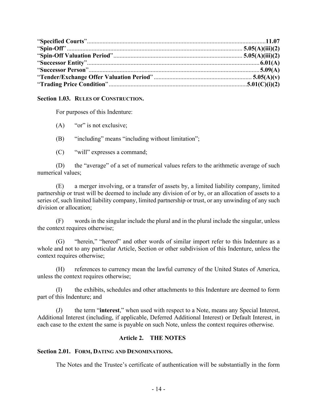 - 14 - “Specified Courts” ...................................................................................................................11.07 “Spin-Off” ................................................................................................................. 5.05(A)(iii)(2) “Spin-Off Valuation Period” ................................................................................... 5.05(A)(iii)(2) “Successor Entity” ............................................................................................................... 6.01(A) “Successor Person” .............................................................................................................. 5.09(A) “Tender/Exchange Offer Valuation Period” ............................................................... 5.05(A)(v) “Trading Price Condition” .........................................................................................5.01(C)(i)(2) Section 1.03. RULES OF CONSTRUCTION. For purposes of this Indenture: (A) “or” is not exclusive; (B) “including” means “including without limitation”; (C) “will” expresses a command; (D) the “average” of a set of numerical values refers to the arithmetic average of such numerical values; (E) a merger involving, or a transfer of assets by, a limited liability company, limited partnership or trust will be deemed to include any division of or by, or an allocation of assets to a series of, such limited liability company, limited partnership or trust, or any unwinding of any such division or allocation; (F) words in the singular include the plural and in the plural include the singular, unless the context requires otherwise; (G) “herein,” “hereof” and other words of similar import refer to this Indenture as a whole and not to any particular Article, Section or other subdivision of this Indenture, unless the context requires otherwise; (H) references to currency mean the lawful currency of the United States of America, unless the context requires otherwise; (I) the exhibits, schedules and other attachments to this Indenture are deemed to form part of this Indenture; and (J) the term “interest,” when used with respect to a Note, means any Special Interest, Additional Interest (including, if applicable, Deferred Additional Interest) or Default Interest, in each case to the extent the same is payable on such Note, unless the context requires otherwise. Article 2. THE NOTES Section 2.01. FORM, DATING AND DENOMINATIONS. The Notes and the Trustee’s certificate of authentication will be substantially in the form