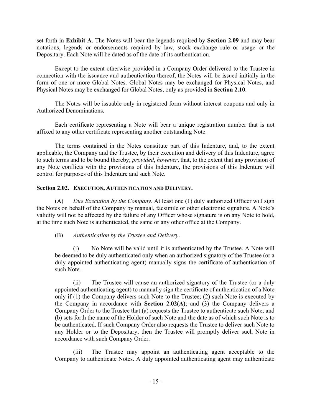 - 15 - set forth in Exhibit A. The Notes will bear the legends required by Section 2.09 and may bear notations, legends or endorsements required by law, stock exchange rule or usage or the Depositary. Each Note will be dated as of the date of its authentication. Except to the extent otherwise provided in a Company Order delivered to the Trustee in connection with the issuance and authentication thereof, the Notes will be issued initially in the form of one or more Global Notes. Global Notes may be exchanged for Physical Notes, and Physical Notes may be exchanged for Global Notes, only as provided in Section 2.10. The Notes will be issuable only in registered form without interest coupons and only in Authorized Denominations. Each certificate representing a Note will bear a unique registration number that is not affixed to any other certificate representing another outstanding Note. The terms contained in the Notes constitute part of this Indenture, and, to the extent applicable, the Company and the Trustee, by their execution and delivery of this Indenture, agree to such terms and to be bound thereby; provided, however, that, to the extent that any provision of any Note conflicts with the provisions of this Indenture, the provisions of this Indenture will control for purposes of this Indenture and such Note. Section 2.02. EXECUTION, AUTHENTICATION AND DELIVERY. (A) Due Execution by the Company. At least one (1) duly authorized Officer will sign the Notes on behalf of the Company by manual, facsimile or other electronic signature. A Note’s validity will not be affected by the failure of any Officer whose signature is on any Note to hold, at the time such Note is authenticated, the same or any other office at the Company. (B) Authentication by the Trustee and Delivery. (i) No Note will be valid until it is authenticated by the Trustee. A Note will be deemed to be duly authenticated only when an authorized signatory of the Trustee (or a duly appointed authenticating agent) manually signs the certificate of authentication of such Note. (ii) The Trustee will cause an authorized signatory of the Trustee (or a duly appointed authenticating agent) to manually sign the certificate of authentication of a Note only if (1) the Company delivers such Note to the Trustee; (2) such Note is executed by the Company in accordance with Section 2.02(A); and (3) the Company delivers a Company Order to the Trustee that (a) requests the Trustee to authenticate such Note; and (b) sets forth the name of the Holder of such Note and the date as of which such Note is to be authenticated. If such Company Order also requests the Trustee to deliver such Note to any Holder or to the Depositary, then the Trustee will promptly deliver such Note in accordance with such Company Order. (iii) The Trustee may appoint an authenticating agent acceptable to the Company to authenticate Notes. A duly appointed authenticating agent may authenticate