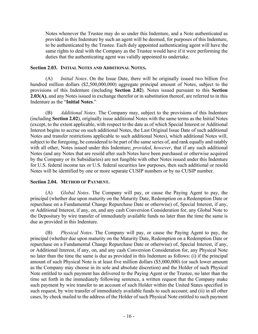 - 16 - Notes whenever the Trustee may do so under this Indenture, and a Note authenticated as provided in this Indenture by such an agent will be deemed, for purposes of this Indenture, to be authenticated by the Trustee. Each duly appointed authenticating agent will have the same rights to deal with the Company as the Trustee would have if it were performing the duties that the authenticating agent was validly appointed to undertake. Section 2.03. INITIAL NOTES AND ADDITIONAL NOTES. (A) Initial Notes. On the Issue Date, there will be originally issued two billion five hundred million dollars ($2,500,000,000) aggregate principal amount of Notes, subject to the provisions of this Indenture (including Section 2.02). Notes issued pursuant to this Section 2.03(A), and any Notes issued in exchange therefor or in substitution thereof, are referred to in this Indenture as the “Initial Notes.” (B) Additional Notes. The Company may, subject to the provisions of this Indenture (including Section 2.02), originally issue additional Notes with the same terms as the Initial Notes (except, to the extent applicable, with respect to the date as of which Special Interest or Additional Interest begins to accrue on such additional Notes, the Last Original Issue Date of such additional Notes and transfer restrictions applicable to such additional Notes), which additional Notes will, subject to the foregoing, be considered to be part of the same series of, and rank equally and ratably with all other, Notes issued under this Indenture; provided, however, that if any such additional Notes (and any Notes that are resold after such Notes have been purchased or otherwise acquired by the Company or its Subsidiaries) are not fungible with other Notes issued under this Indenture for U.S. federal income tax or U.S. federal securities law purposes, then such additional or resold Notes will be identified by one or more separate CUSIP numbers or by no CUSIP number. Section 2.04. METHOD OF PAYMENT. (A) Global Notes. The Company will pay, or cause the Paying Agent to pay, the principal (whether due upon maturity on the Maturity Date, Redemption on a Redemption Date or repurchase on a Fundamental Change Repurchase Date or otherwise) of, Special Interest, if any, or Additional Interest, if any, on, and any cash Conversion Consideration for, any Global Note to the Depositary by wire transfer of immediately available funds no later than the time the same is due as provided in this Indenture. (B) Physical Notes. The Company will pay, or cause the Paying Agent to pay, the principal (whether due upon maturity on the Maturity Date, Redemption on a Redemption Date or repurchase on a Fundamental Change Repurchase Date or otherwise) of, Special Interest, if any, or Additional Interest, if any, on, and any cash Conversion Consideration for, any Physical Note no later than the time the same is due as provided in this Indenture as follows: (i) if the principal amount of such Physical Note is at least five million dollars ($5,000,000) (or such lower amount as the Company may choose in its sole and absolute discretion) and the Holder of such Physical Note entitled to such payment has delivered to the Paying Agent or the Trustee, no later than the time set forth in the immediately following sentence, a written request that the Company make such payment by wire transfer to an account of such Holder within the United States specified in such request, by wire transfer of immediately available funds to such account; and (ii) in all other cases, by check mailed to the address of the Holder of such Physical Note entitled to such payment