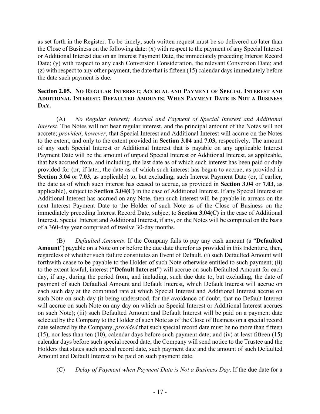 - 17 - as set forth in the Register. To be timely, such written request must be so delivered no later than the Close of Business on the following date: (x) with respect to the payment of any Special Interest or Additional Interest due on an Interest Payment Date, the immediately preceding Interest Record Date; (y) with respect to any cash Conversion Consideration, the relevant Conversion Date; and (z) with respect to any other payment, the date that is fifteen (15) calendar days immediately before the date such payment is due. Section 2.05. NO REGULAR INTEREST; ACCRUAL AND PAYMENT OF SPECIAL INTEREST AND ADDITIONAL INTEREST; DEFAULTED AMOUNTS; WHEN PAYMENT DATE IS NOT A BUSINESS DAY. (A) No Regular Interest; Accrual and Payment of Special Interest and Additional Interest. The Notes will not bear regular interest, and the principal amount of the Notes will not accrete; provided, however, that Special Interest and Additional Interest will accrue on the Notes to the extent, and only to the extent provided in Section 3.04 and 7.03, respectively. The amount of any such Special Interest or Additional Interest that is payable on any applicable Interest Payment Date will be the amount of unpaid Special Interest or Additional Interest, as applicable, that has accrued from, and including, the last date as of which such interest has been paid or duly provided for (or, if later, the date as of which such interest has begun to accrue, as provided in Section 3.04 or 7.03, as applicable) to, but excluding, such Interest Payment Date (or, if earlier, the date as of which such interest has ceased to accrue, as provided in Section 3.04 or 7.03, as applicable), subject to Section 3.04(C) in the case of Additional Interest. If any Special Interest or Additional Interest has accrued on any Note, then such interest will be payable in arrears on the next Interest Payment Date to the Holder of such Note as of the Close of Business on the immediately preceding Interest Record Date, subject to Section 3.04(C) in the case of Additional Interest. Special Interest and Additional Interest, if any, on the Notes will be computed on the basis of a 360-day year comprised of twelve 30-day months. (B) Defaulted Amounts. If the Company fails to pay any cash amount (a “Defaulted Amount”) payable on a Note on or before the due date therefor as provided in this Indenture, then, regardless of whether such failure constitutes an Event of Default, (i) such Defaulted Amount will forthwith cease to be payable to the Holder of such Note otherwise entitled to such payment; (ii) to the extent lawful, interest (“Default Interest”) will accrue on such Defaulted Amount for each day, if any, during the period from, and including, such due date to, but excluding, the date of payment of such Defaulted Amount and Default Interest, which Default Interest will accrue on each such day at the combined rate at which Special Interest and Additional Interest accrue on such Note on such day (it being understood, for the avoidance of doubt, that no Default Interest will accrue on such Note on any day on which no Special Interest or Additional Interest accrues on such Note); (iii) such Defaulted Amount and Default Interest will be paid on a payment date selected by the Company to the Holder of such Note as of the Close of Business on a special record date selected by the Company, provided that such special record date must be no more than fifteen (15), nor less than ten (10), calendar days before such payment date; and (iv) at least fifteen (15) calendar days before such special record date, the Company will send notice to the Trustee and the Holders that states such special record date, such payment date and the amount of such Defaulted Amount and Default Interest to be paid on such payment date. (C) Delay of Payment when Payment Date is Not a Business Day. If the due date for a